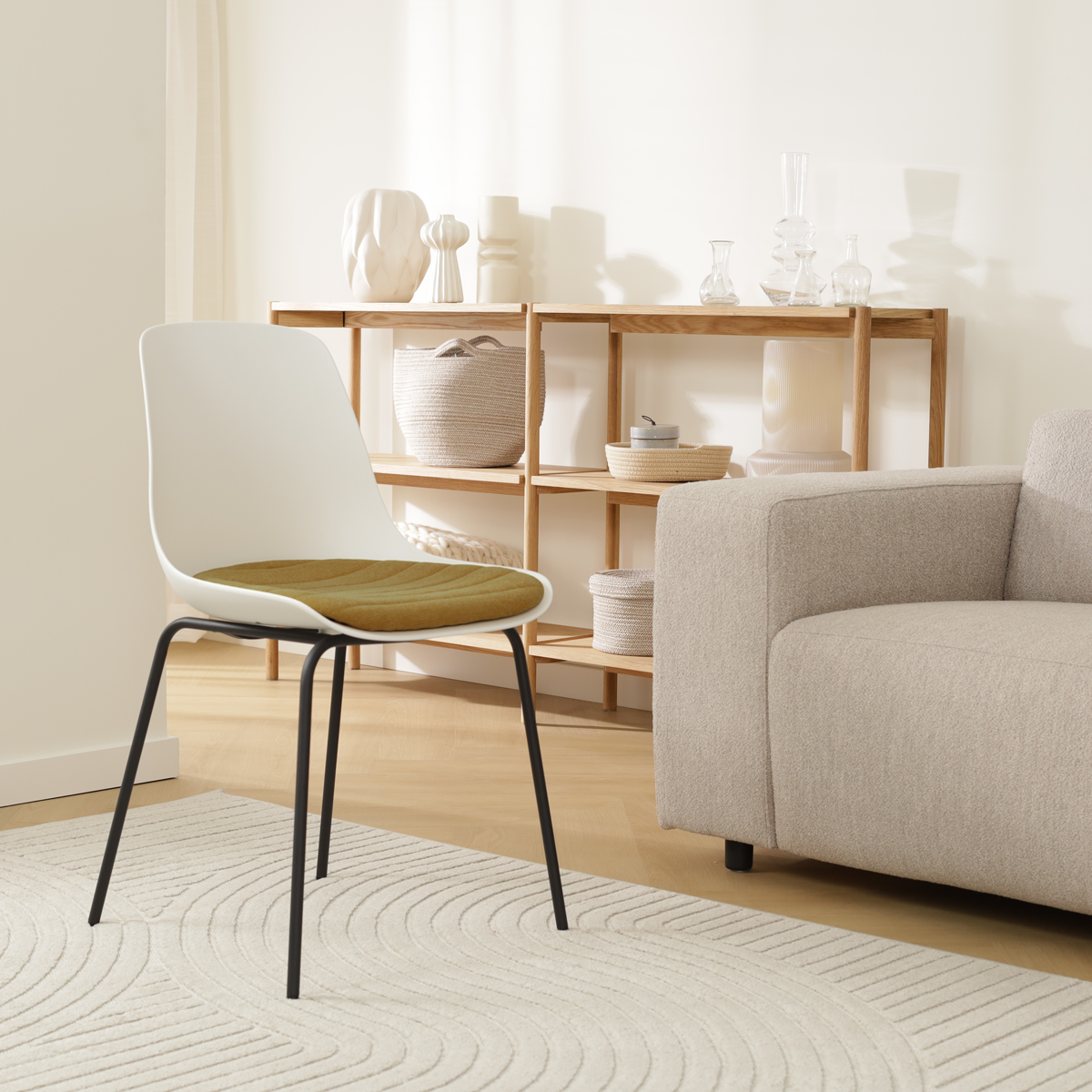 Deze eetkamerstoel combineert verschillende materialen op stijlvolle wijze en geeft de eethoek daarmee een echte upgrade. De duurzame kunststof zitting is niet alleen gemakkelijk schoon te maken, maar biedt ook een stevige en comfortabele basis. Het metalen onderstel met ranke pootjes zorgt ervoor dat de eetkamerstoel stabiel op de grond staat en draagt bij aan het tijdloze karakter van dit ontwerp. Naast de ergonomisch ontworpen kunststof zitting draagt ook het vaste zitkussen bij aan het zitcomfort van deze stoel. Het kussen is bekleed met hoogwaardige stof en is in vijf verschillende kleuren verkrijgbaar. Met een keuze tussen zwart en wit voor de kunststof kuip en daarnaast nog de twee kleuren waarin het Nora onderstel verkrijgbaar is, is de Nora-Liv eetkamerstoel in ieder interieur te combineren.