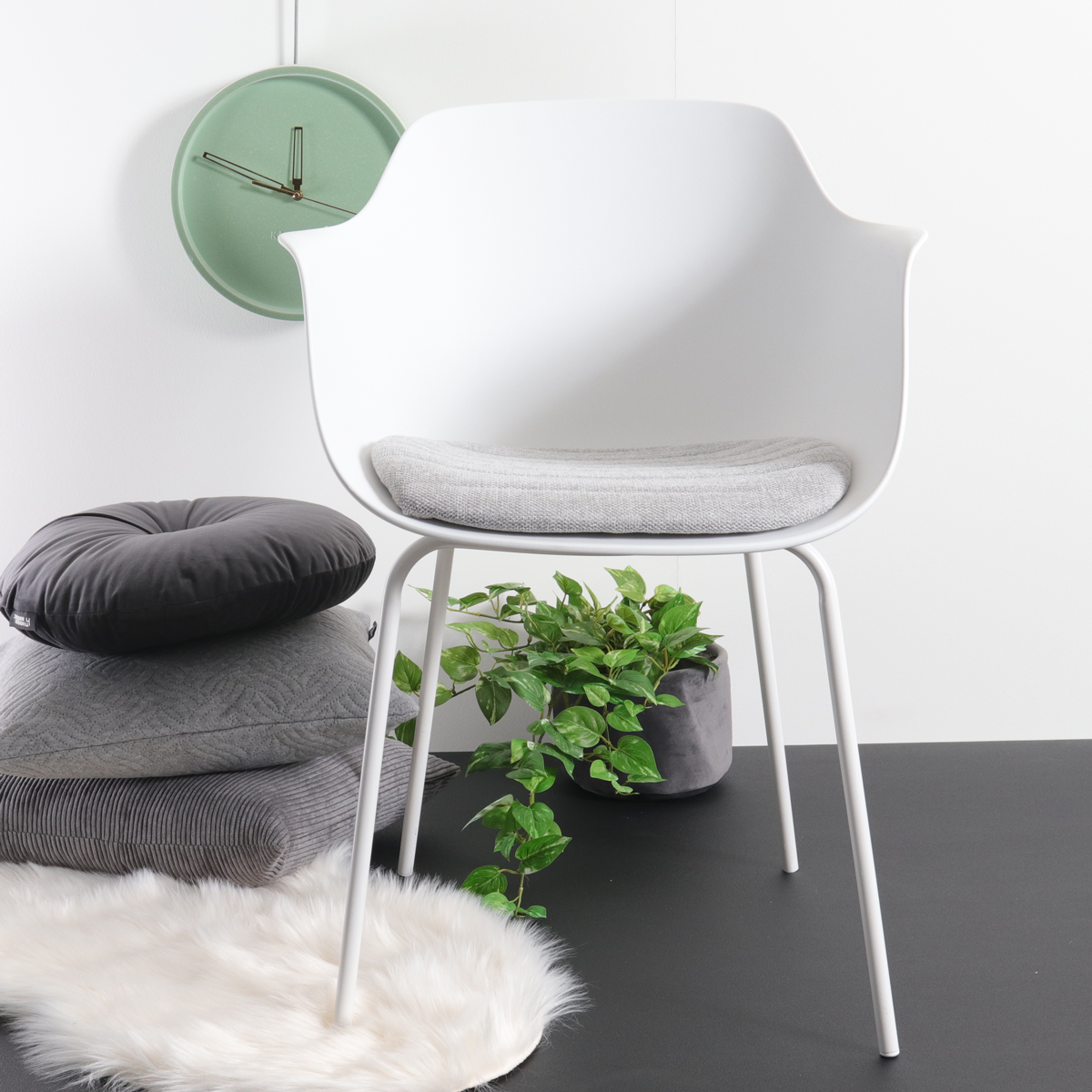 De zitting van deze eetkamerstoel is verkrijgbaar in het kunststof en je kunt kiezen uit verschillende kleuren vaste zitkussens in de stoel. Bovendien heeft de zitting armleuningen, voor nog meer comfort. Kortom een ideale stoel voor bij jou thuis!
