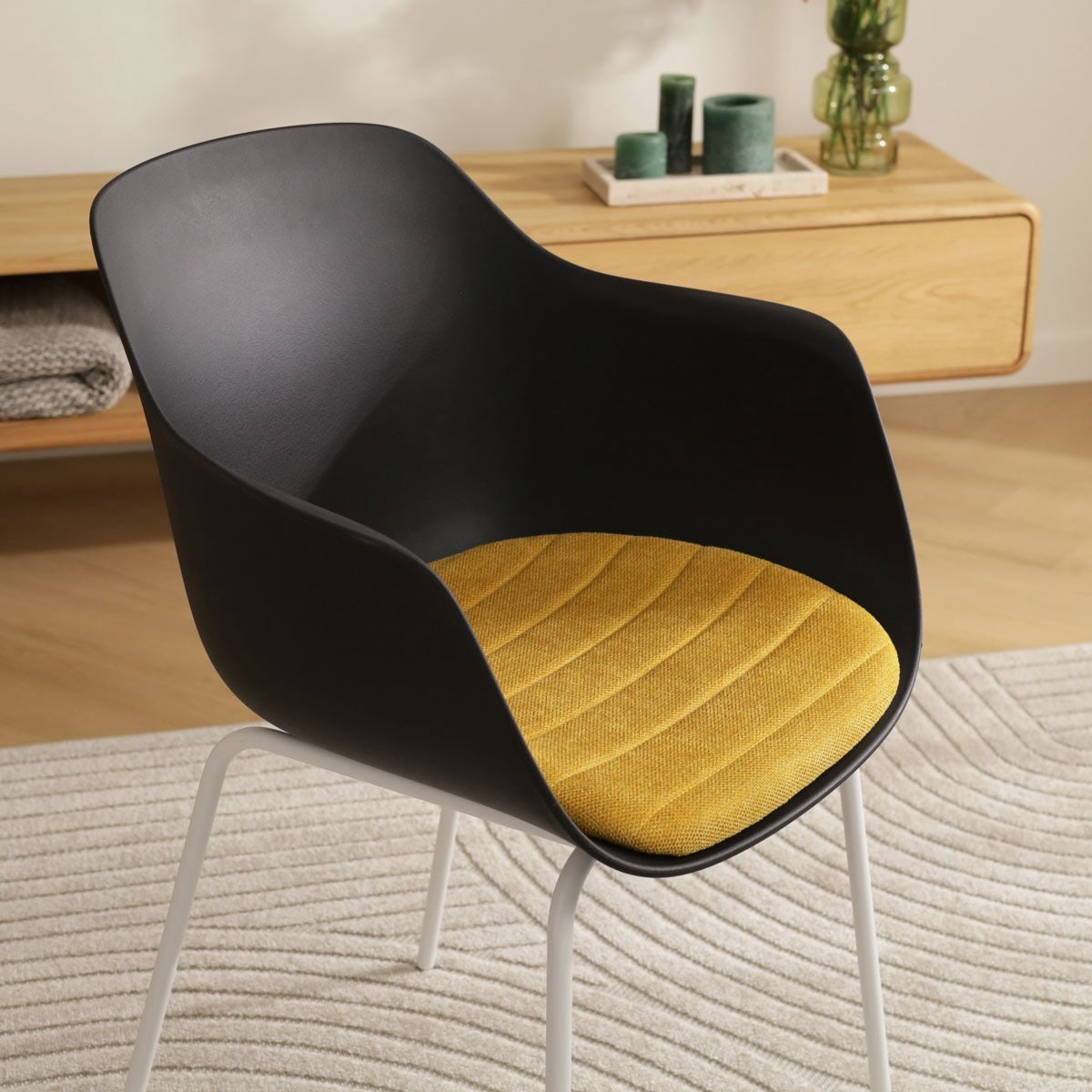 De zitting van deze eetkamerstoel is verkrijgbaar in het kunststof en je kunt kiezen uit verschillende kleuren vaste zitkussens in de stoel. Bovendien heeft de zitting armleuningen, voor nog meer comfort. Gebruik de stoel in de eetkamer aan de grote eettafel om urenlang te kunnen natafelen, in de slaapkamer om je kleding op te leggen en in de gang om gemakkelijk je schoenen aan- en uit te trekken. Kortom een ideale stoel voor bij jou thuis!