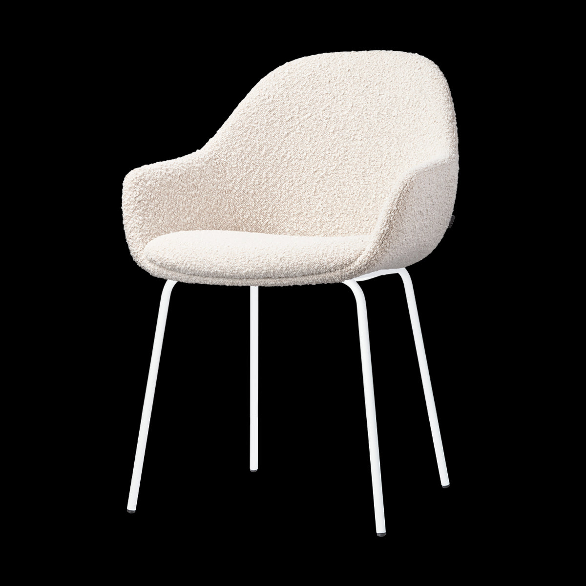 De Nora-Mae bouclé beige eetkamerstoel met witte poten van Nolon is onderdeel van een mix en match collectie. Dit betekent dat zowel het onderstel als de zitting van deze stoel in diverse andere combinaties verkrijgbaar zijn. De Mae zitting is verkrijgbaar in zes verschillende stoffen en kleuren, maar het metalen Nora onderstel kan ook gecombineerd worden met één van de andere zittingen van Nolon. De Mae zitting kan juist weer worden gecombineerd met alle andere onderstellen, zoals een draaibaar onderstel of een onderstel met houten poten.