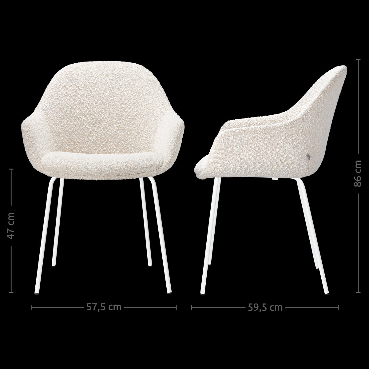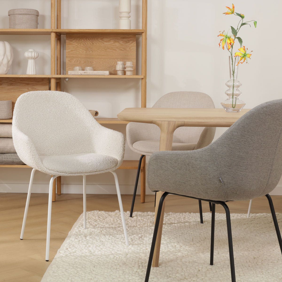 De Nora-Mae eetkamerstoel in bouclé beige met witte poten voegt direct een vleugje elegantie toe aan jouw interieur. Dankzij het moderne Scandinavische design met zachte rondingen is deze stoel niet alleen een lust voor het oog, maar ook een genot om op te zitten. De armleuningen bieden extra steun, waardoor je urenlang comfortabel kunt natafelen met familie en vrienden. De bouclé stof in beige kleur straalt luxe en warmte uit, terwijl de stevige metalen poten zorgen voor stabiliteit en duurzaamheid. Of je nu een minimalistisch, Scandinavisch of landelijk interieur hebt, deze eetkamerstoel past moeiteloos in verschillende stijlen. Met de Nora-Mae eetkamerstoel creëer je een uitnodigende sfeer in jouw eetruimte waar iedereen graag aanschuift.