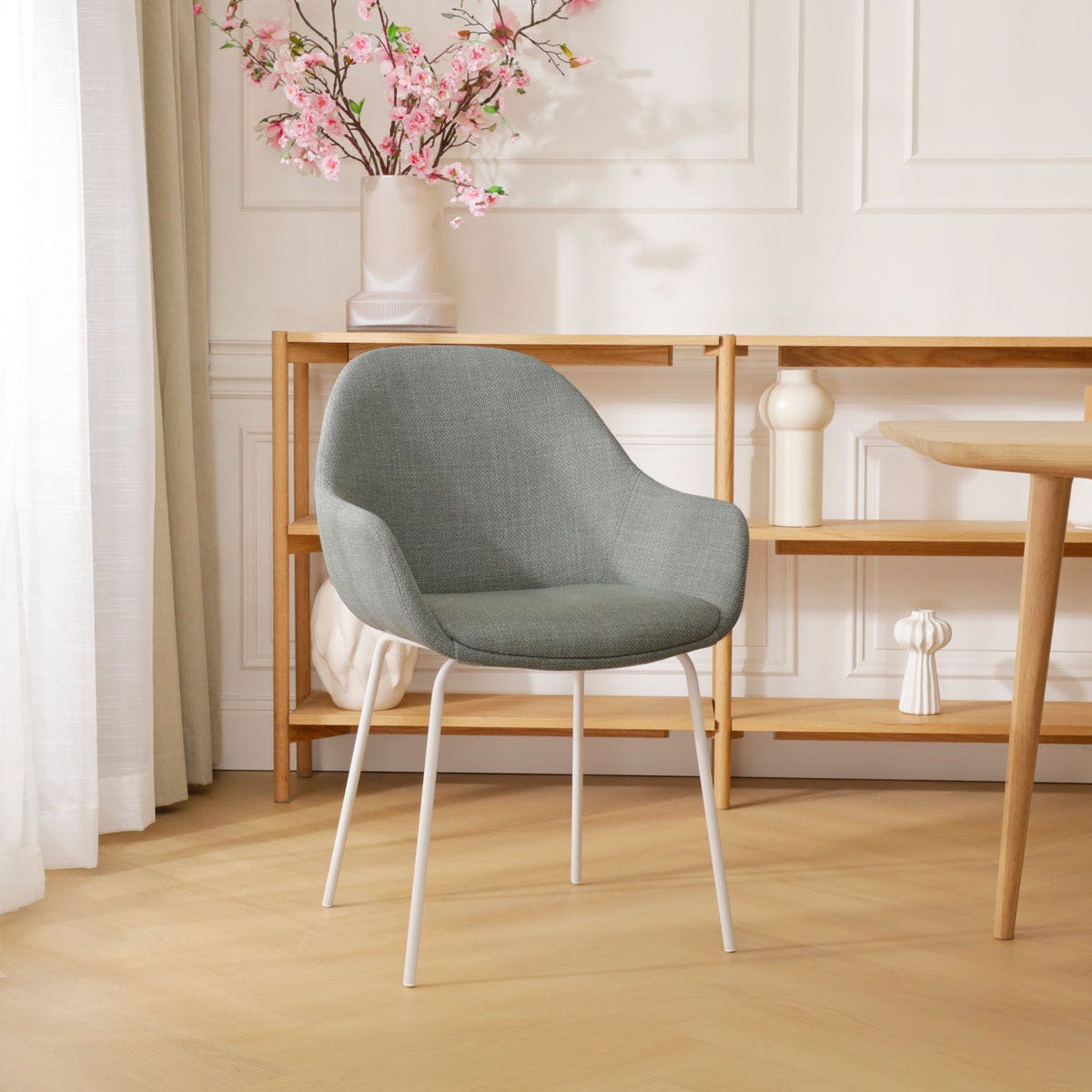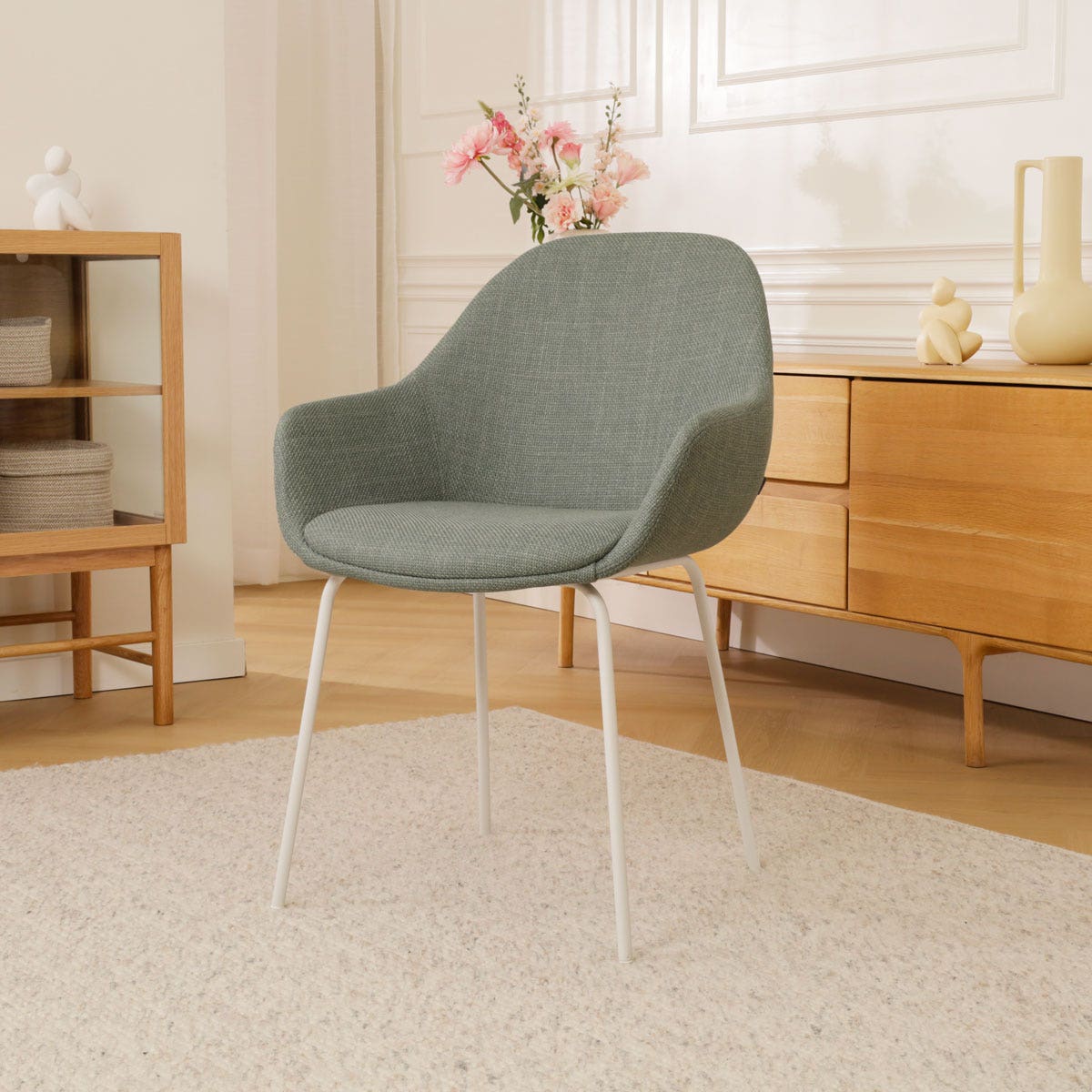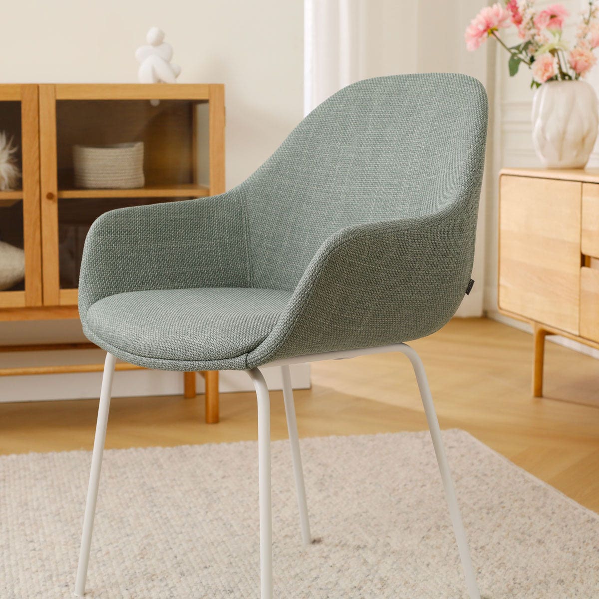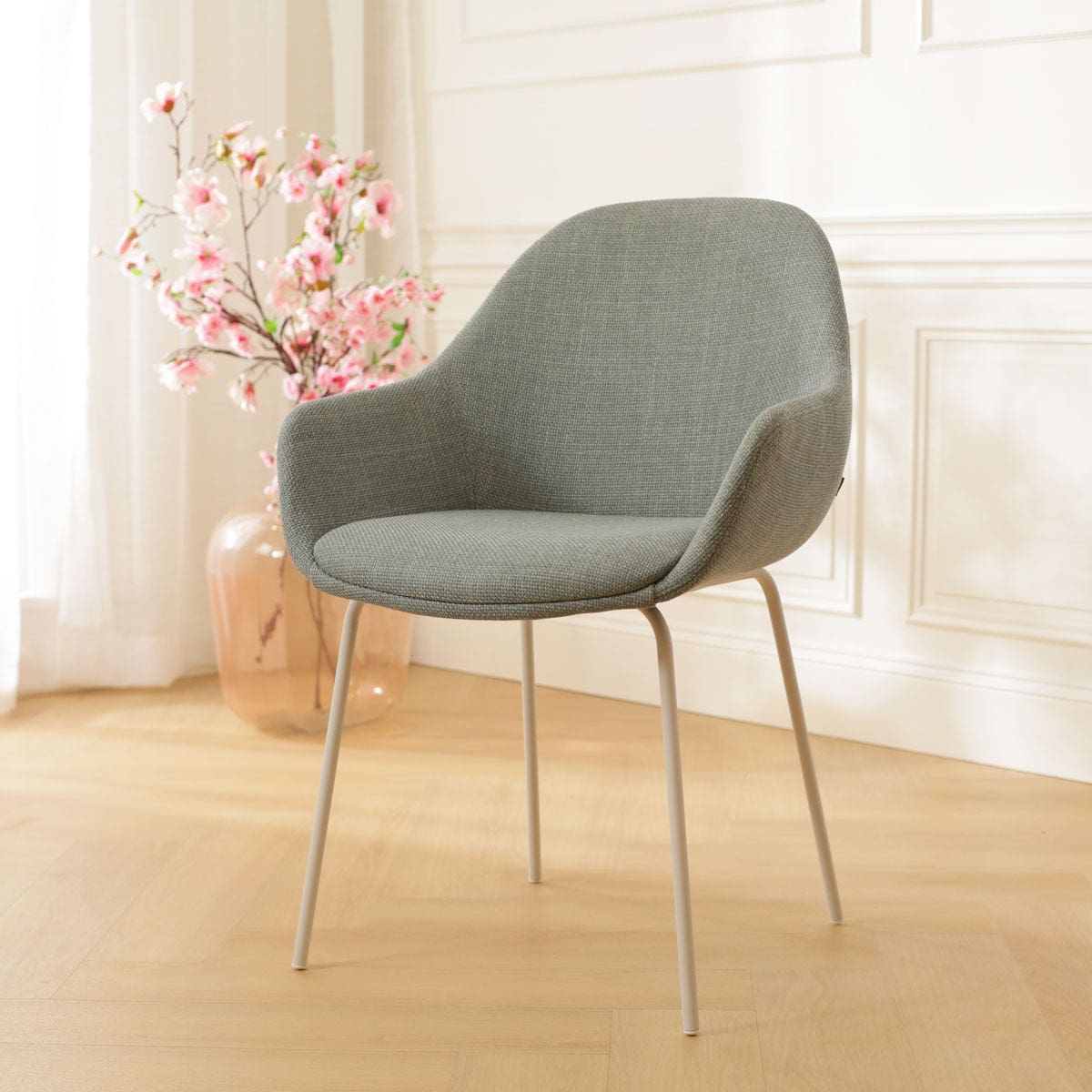 Deze eetkamerstoel is de ideale combinatie van een modern metalen onderstel met een uitnodigende stoffen zitting. Het ranke onderstel met de vier metalen poten zorgt voor een stabiele zit en geeft de eetkamerstoel de nodige elegantie. De comfortabele zitting is voorzien van armleuningen, zodat urenlang natafelen een gemak is. De Nora-Mae eetkamerstoel heeft een rugleuning in ronde vorm en ook de andere hoeken van de zitting zijn mooi afgerond, wat de stoel een zachte en organische uitstraling geeft. De combinatie van de saliegroene zitting met de witte poten maakt deze eettafelstoel een perfecte match met een Scandinavisch interieur.