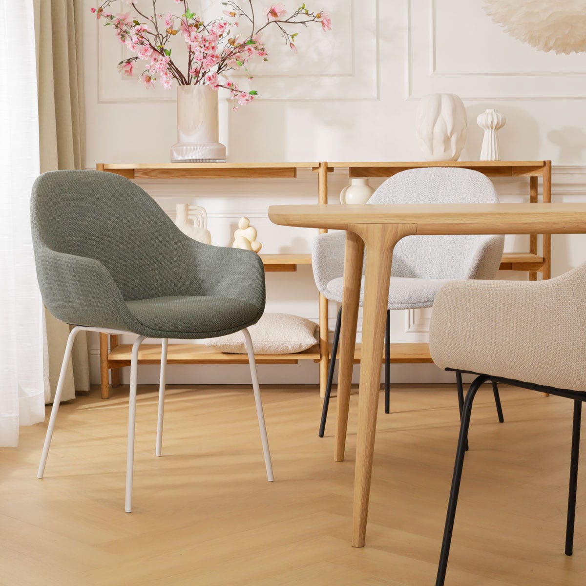 CreCreërer een eethoek in Scandinavische stijl met de saliegroene eetkamerstoel Nora-Mae van Nolon.