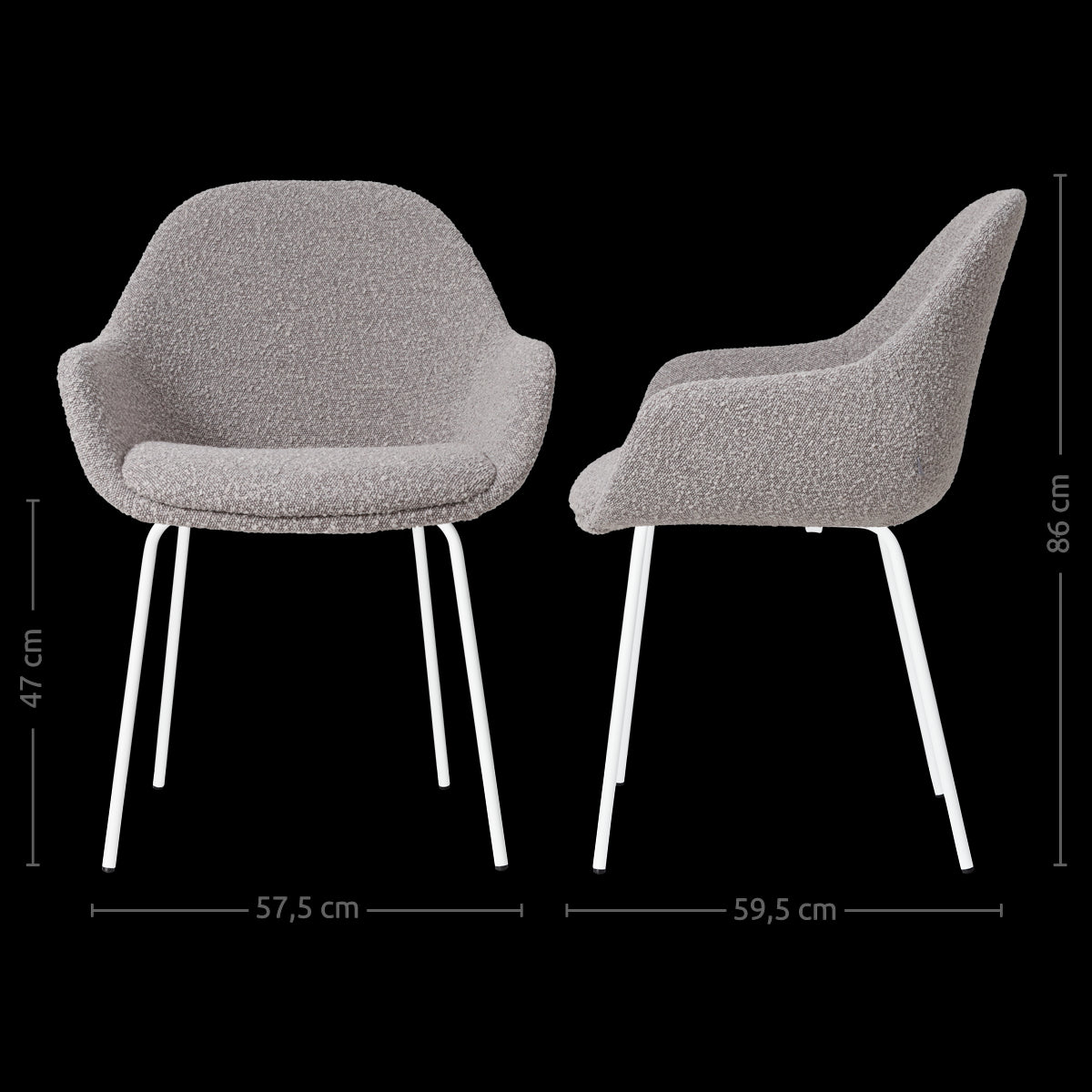 Deze eetkamerstoel is de ideale combinatie van een modern metalen onderstel met een uitnodigende stoffen zitting. Het ranke onderstel met de vier metalen poten zorgt voor een stabiele zit en geeft de eetkamerstoel de nodige elegantie. De kuipzitting is voorzien van armleuningen zodat urenlang natafelen een gemak is. De zitting van de Nora-Mae eetkamerstoel is verkrijgbaar in twee kleuren en twee verschillende materialen. Ga jij voor een luxe beige bekleding of durf je het aan met een bouclé eetkamerstoel? Welke variant je ook kiest, de Nora-Mae eetkamerstoel maakt van jouw eetkamer een warme en uitnodigende plek om samen te komen met vrienden en familie.