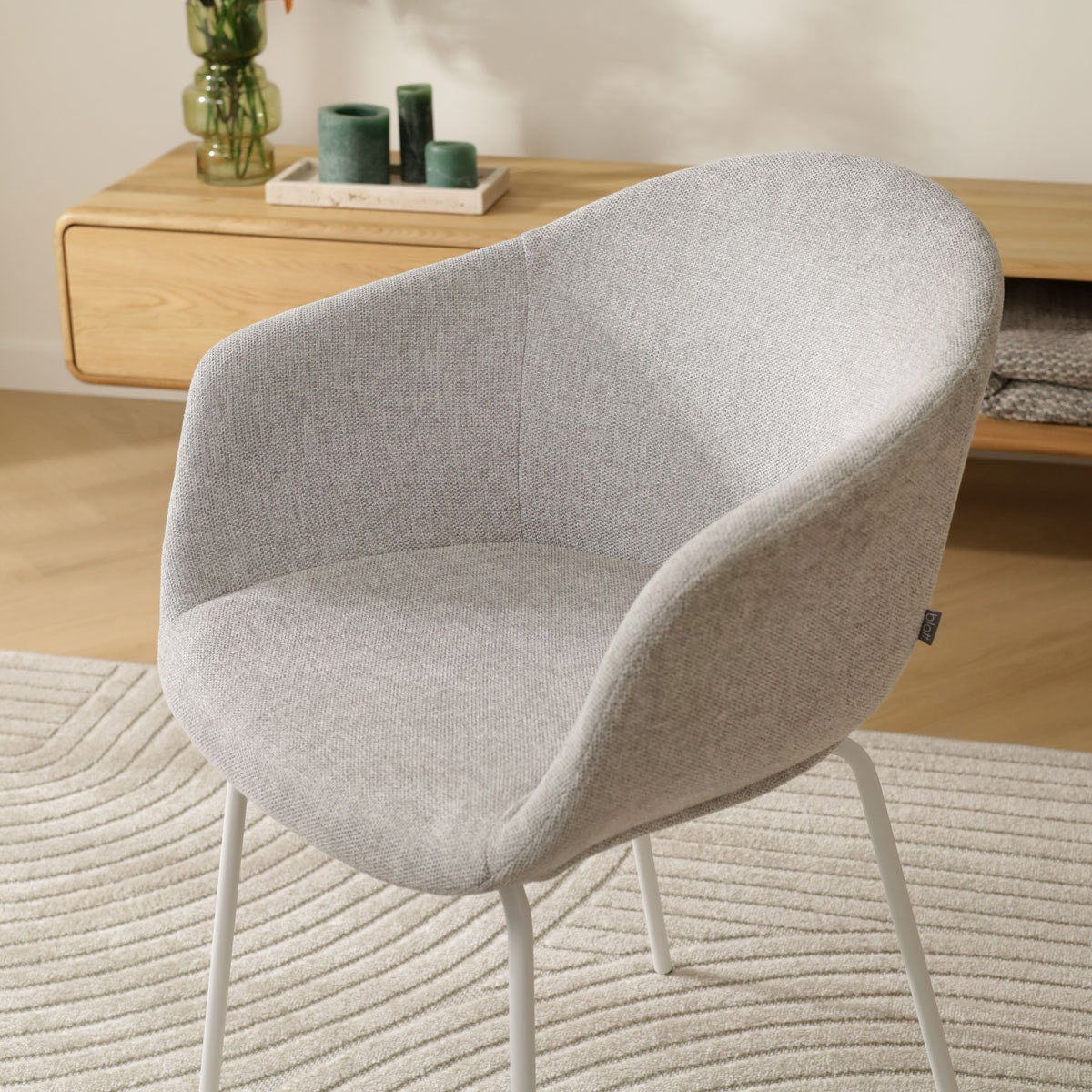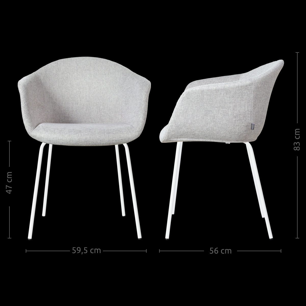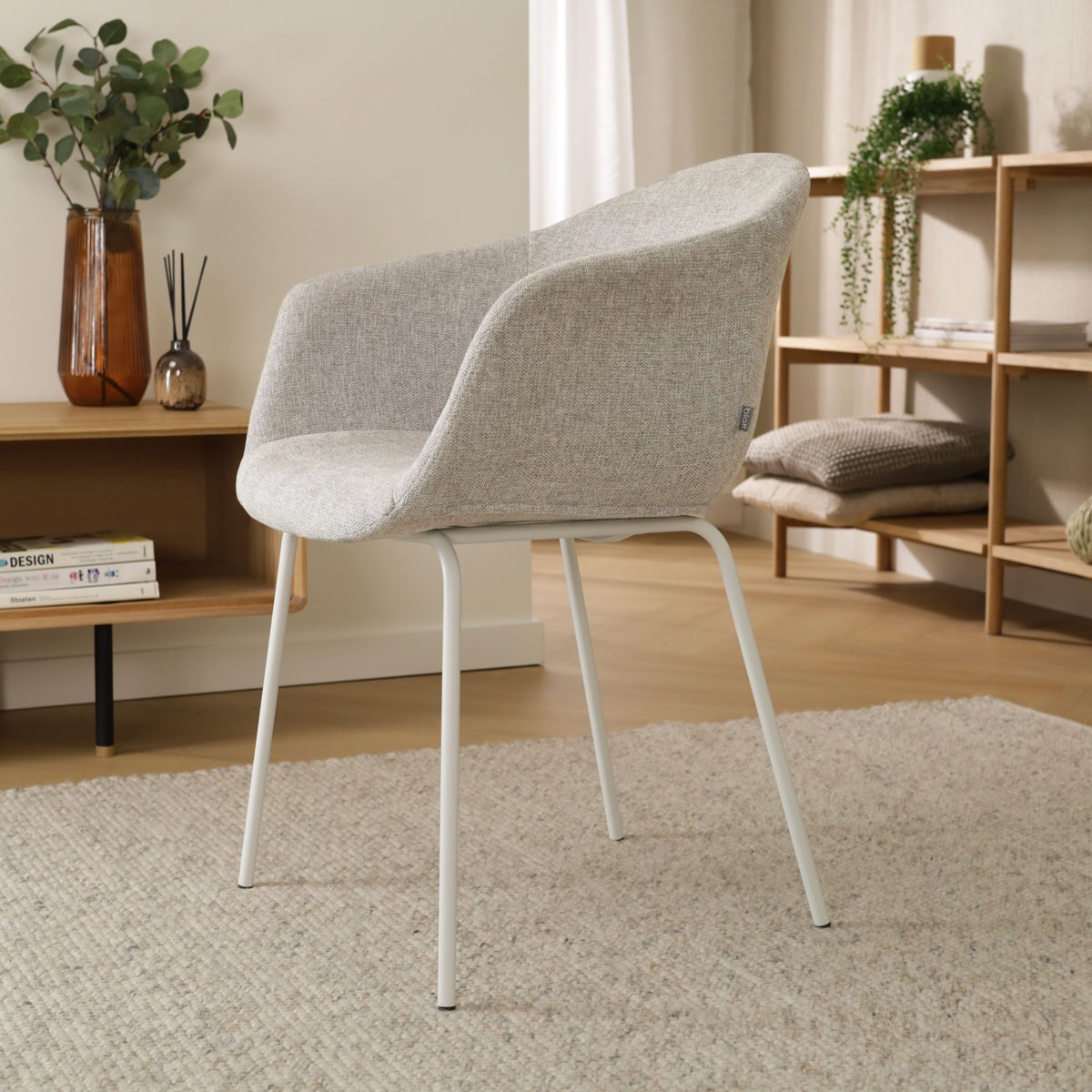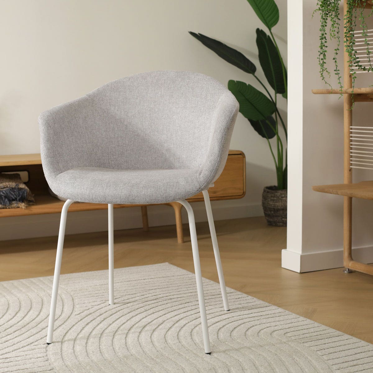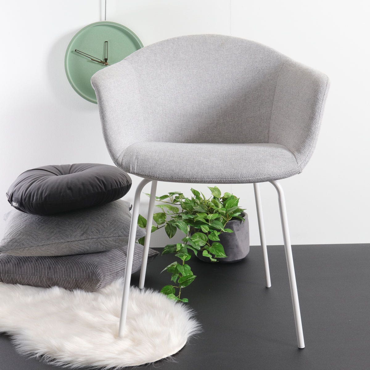 Deze eetkamerstoel heeft elegante uitstraling dankzij het ranke onderstel met vier ronde poten en een comfortabele zit door de ergonomisch gevormde kuipzitting. De stoffen bekleding zorgt voor een warm gevoel en maakt de eetkamer een uitnodigende plek voor vrienden en familie. Het stevige metalen onderstel zorgt ervoor dat de stoel stevig op de grond staat. De gestoffeerde zitting is voorzien van armleuningen om optimaal comfort te bieden tijdens gezellige diners of borrelavonden. In combinatie met de passieve zithouding van deze kuip zit je dus altijd ontspannen aan tafel. Maak een keuze uit één van de zes verschillende kleuren stoffen bekleding en geef jouw eethoek een stijlvolle upgrade.