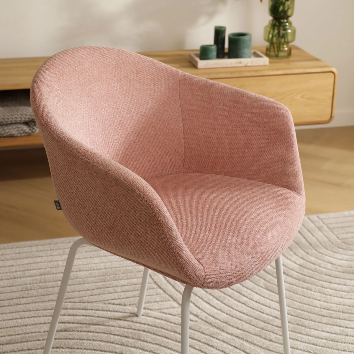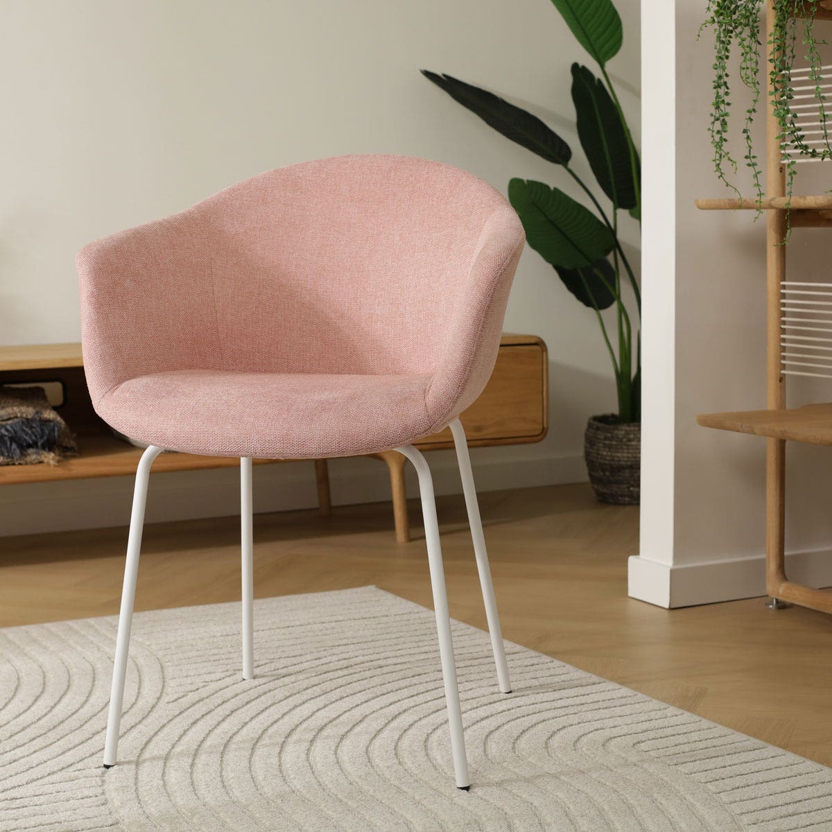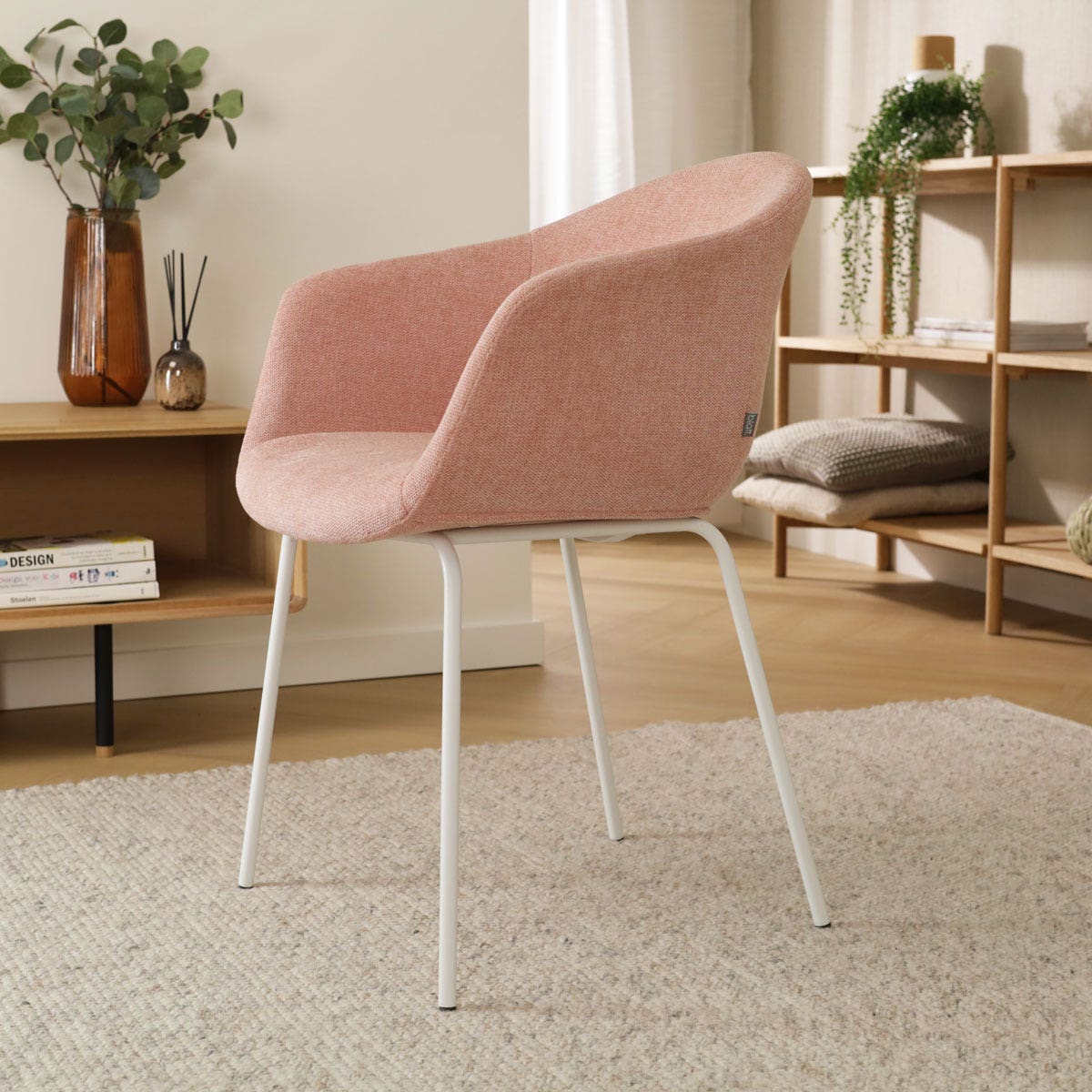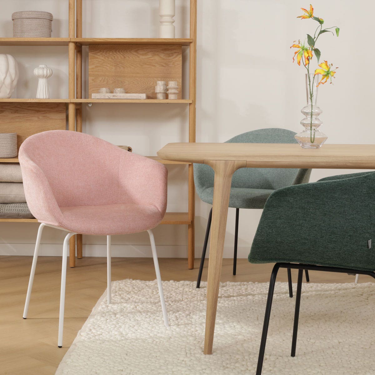 Deze eetkamerstoel heeft elegante uitstraling dankzij het ranke onderstel met vier ronde poten en een comfortabele zit door de ergonomisch gevormde kuipzitting. De stoffen bekleding zorgt voor een warm gevoel en maakt de eetkamer een uitnodigende plek voor vrienden en familie. Het stevige metalen onderstel zorgt ervoor dat de stoel stevig op de grond staat. De gestoffeerde zitting is voorzien van armleuningen om optimaal comfort te bieden tijdens gezellige diners of borrelavonden. In combinatie met de passieve zithouding van deze kuip zit je dus altijd ontspannen aan tafel. Maak een keuze uit één van de zes verschillende kleuren stoffen bekleding en geef jouw eethoek een stijlvolle upgrade.
