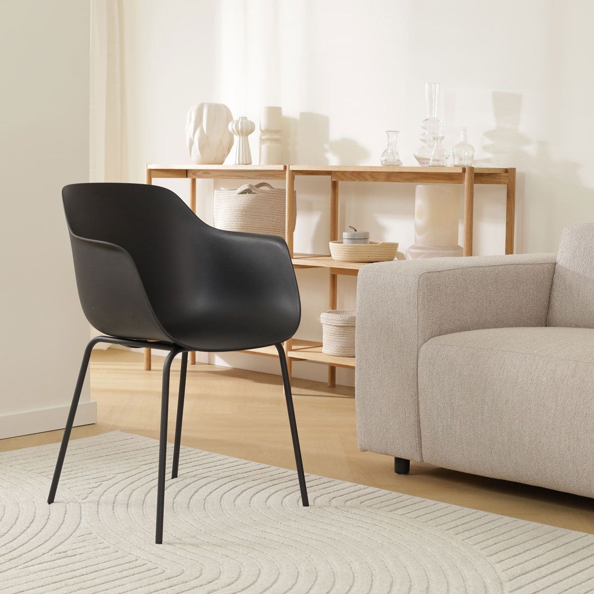 Deze eetkamerstoel combineert metaal en kunststof op stijlvolle wijze en is met dit ontwerp de ideale eetkamerstoel voor een tijdloze basis in de eethoek. Het metalen onderstel met slanke, ronde poten zorgt voor stabiliteit en heeft een minimalistische uitstraling. De zitting is gemaakt van kunststof, wat naast gemakkelijk te onderhouden ook nog eens duurzaam en slijtvast is. Bovendien is een kunststof zitting altijd enigszins flexibel, wat het zitcomfort van deze eetkamerstoel verhoogt. De kuipzitting is daarnaast ook ontworpen met schuin aflopende armleuningen, waardoor je een ontspannen houding kan aannemen aan de eettafel. Is deze kunststof eetkamerstoel precies wat je zoekt maar wil je wel iets zachter zitten? Combineer de Nora-Puk eetkamerstoel dan met het Fem zitkussen van Nolon.