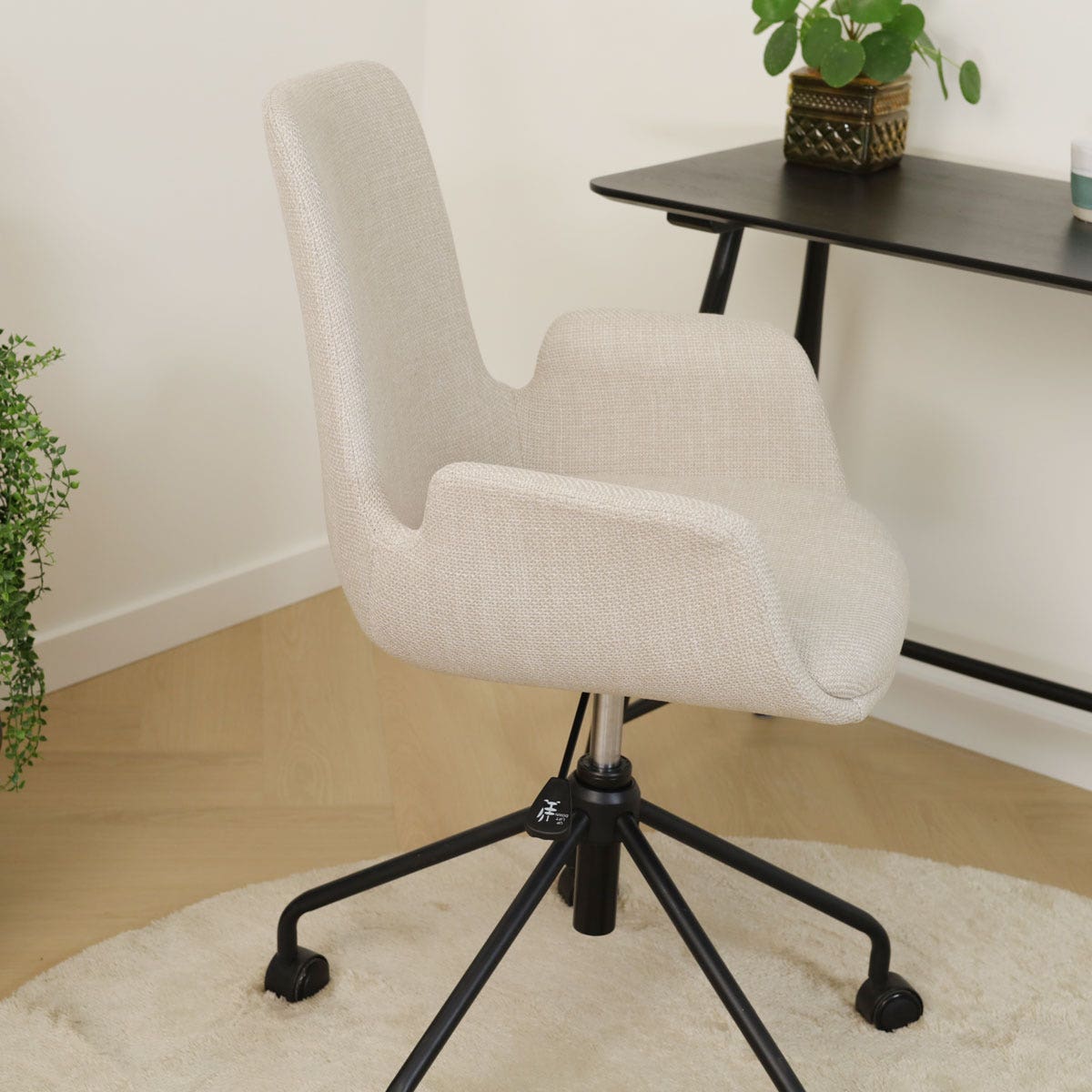De zitting van deze bureaustoel is verkrijgbaar in twee prachtige kleuren: klassiek beige en trendy taupe. Hierdoor kun je de stoel aanpassen aan jouw persoonlijke smaak en kamerdecor. Bovendien kun je kiezen tussen luxe stof en zacht bouclé als materiaal voor de zitting. Beide opties stralen warmte en comfort uit, en ze voegen een vleugje luxe toe aan je werkplek. De zachte zitting en de elegante armleuningen zorgen ervoor dat je urenlang comfortabel kunt werken zonder vermoeid te raken. De armleuningen zijn iets lager dan standaard, zodat de bureaustoel makkelijker onder je bureau past. De rugleuning van de Nout-Eef biedt de juiste ondersteuning voor je rug, zodat je kunt genieten van een gezonde zithouding, zelfs tijdens lange werkdagen. Dankzij het onderstel met wieltjes beweeg je moeiteloos langs je bureau, zonder dat je hoeft op te staan. Of je nu werkt, studeert of ontspant, deze bureaustoel biedt ongekende flexibiliteit en mobiliteit, waardoor je productiever bent dan ooit.