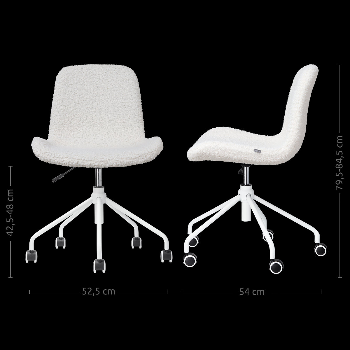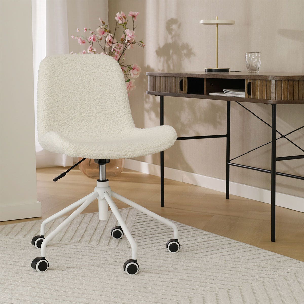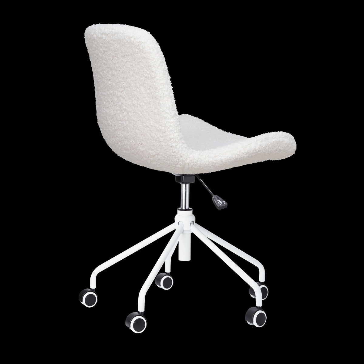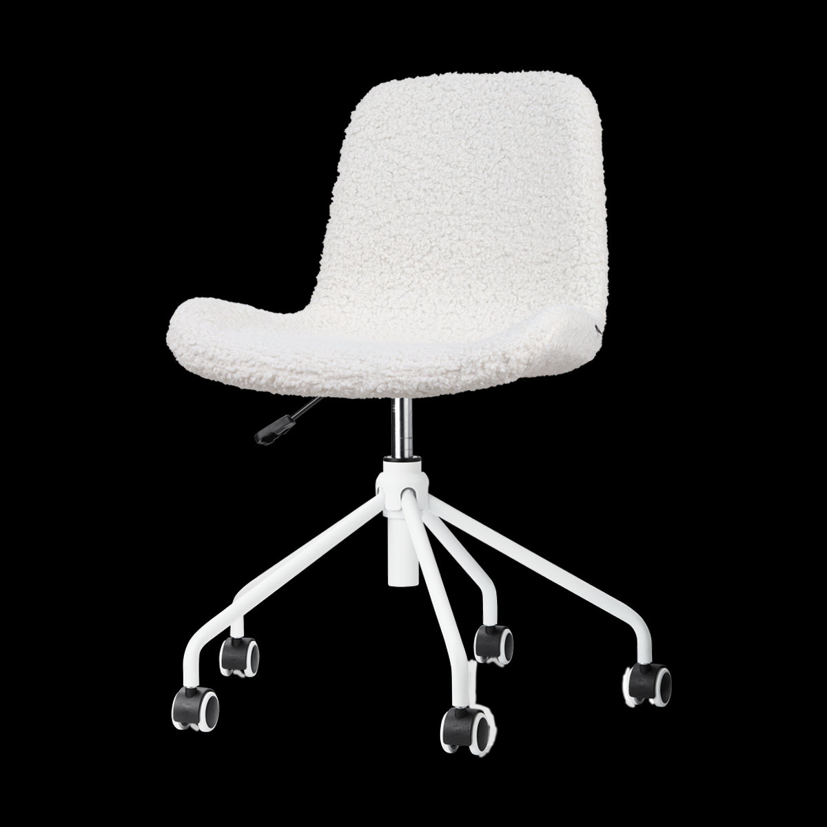 Deze bureaustoel is de ideale keuze als je op zoekt bent naar een exemplaar dat stijlvol, comfortabel en functioneel tegelijk is. Het metalen onderstel van deze bureaustoel is in hoogte verstelbaar, zodat je overal op de juiste zithoogte zit. De zitting kan 360 graden draaien op het onderstel en de stoel is voorzien van wieltjes, zodat je veel bewegingsvrijheid hebt aan je bureau. De zitting is bekleed met hoogwaardige stof voor een zachte zitervaring, en heeft subtiele rondingen en een gevleugeld zitvlak voor een hoog zitcomfort. Dankzij de actieve zithouding zit je rechtop achter je bureau. Maak een keuze uit de verschillende opties voor de bekleding, waaronder teddy en bouclé, en geef jouw werkruimte een stijlvolle upgrade.