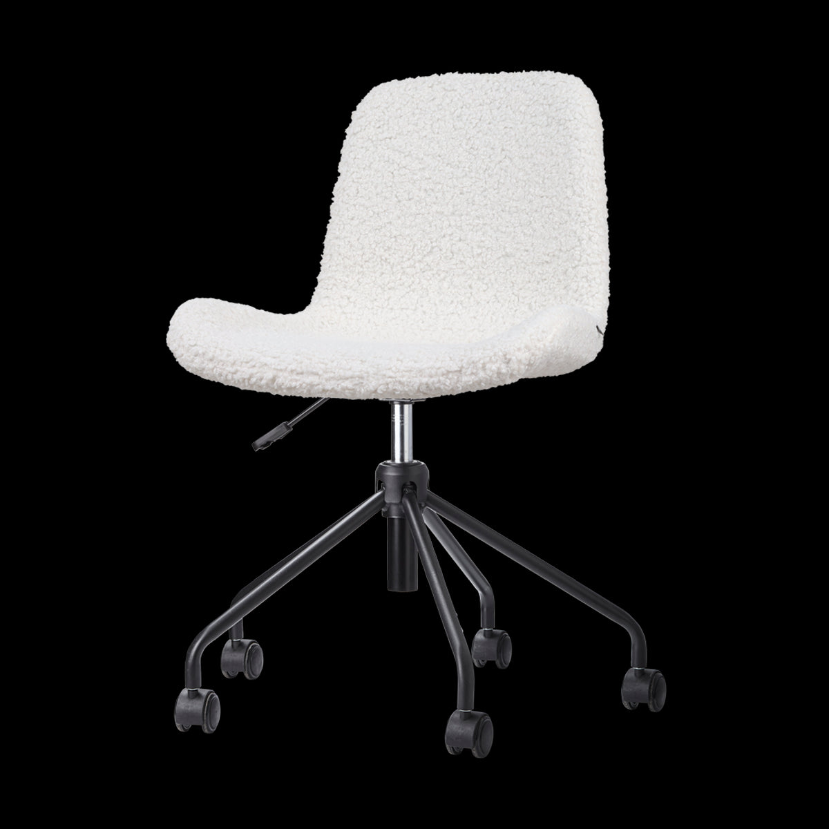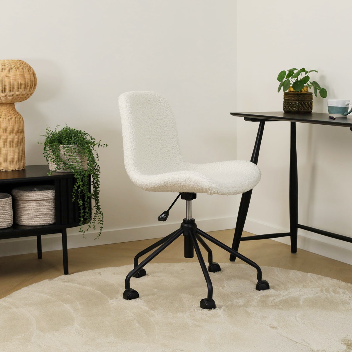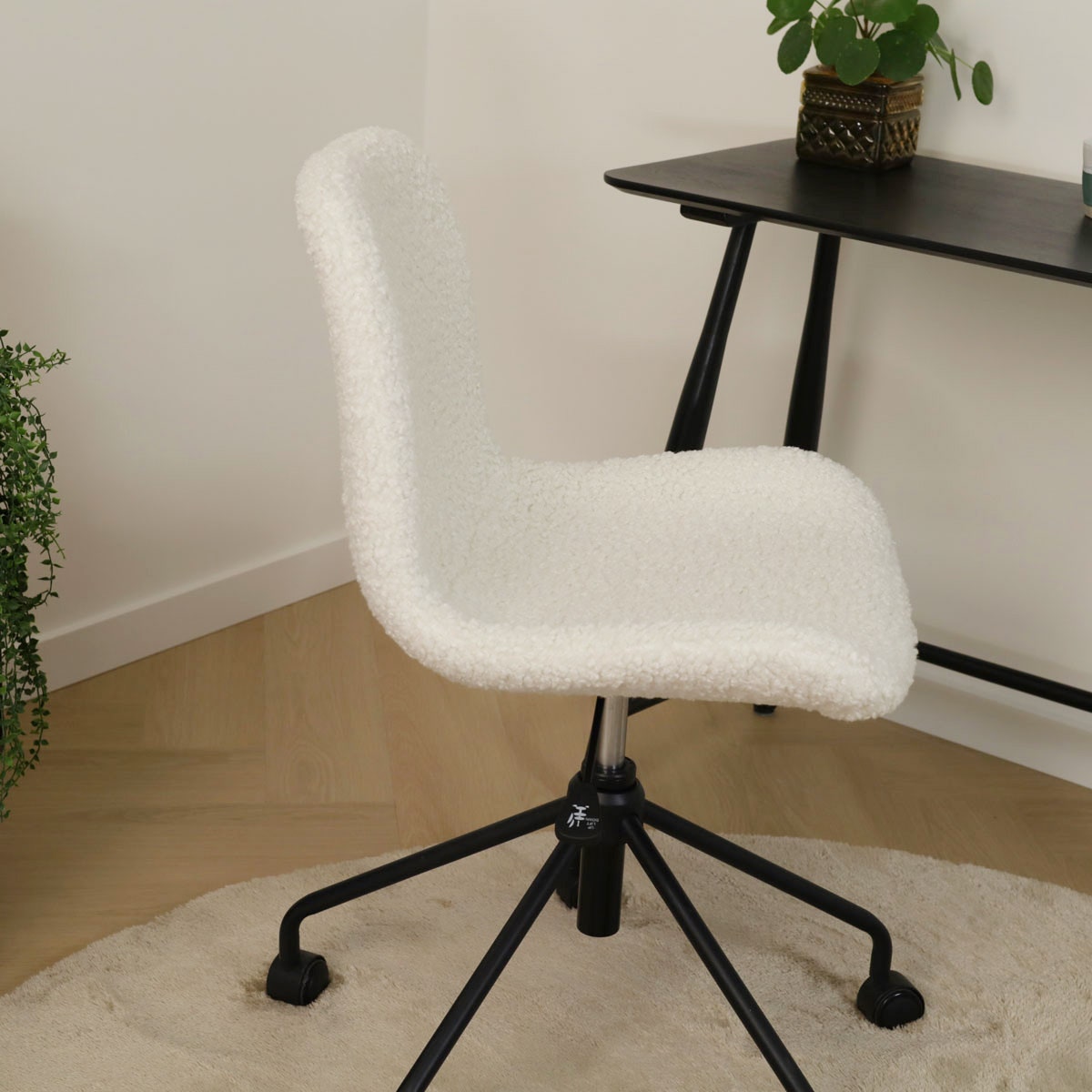 Deze bureaustoel is de ideale keuze als je op zoekt bent naar een exemplaar dat stijlvol, comfortabel en functioneel tegelijk is. Het metalen onderstel van deze bureaustoel is in hoogte verstelbaar, zodat je overal op de juiste zithoogte zit. De zitting kan 360 graden draaien op het onderstel en de stoel is voorzien van wieltjes, zodat je veel bewegingsvrijheid hebt aan je bureau. De zitting is bekleed met hoogwaardige stof voor een zachte zitervaring, en heeft subtiele rondingen en een gevleugeld zitvlak voor een hoog zitcomfort. Dankzij de actieve zithouding zit je rechtop achter je bureau. Maak een keuze uit de verschillende opties voor de bekleding, waaronder teddy en bouclé, en geef jouw werkruimte een stijlvolle upgrade.