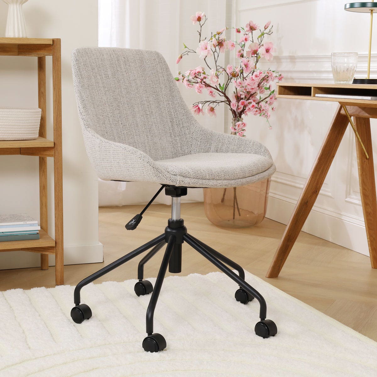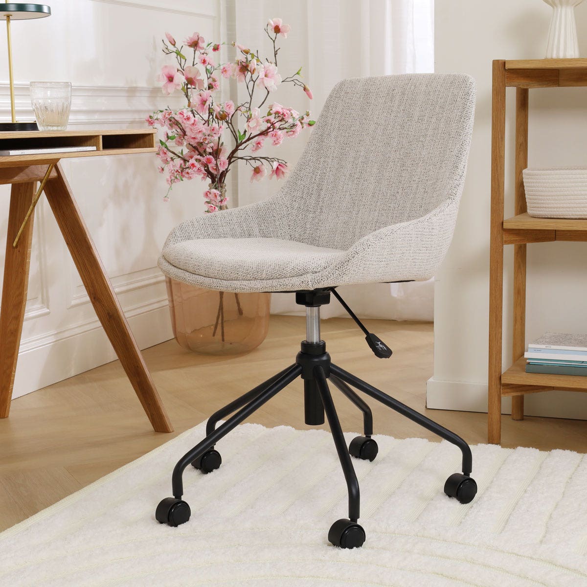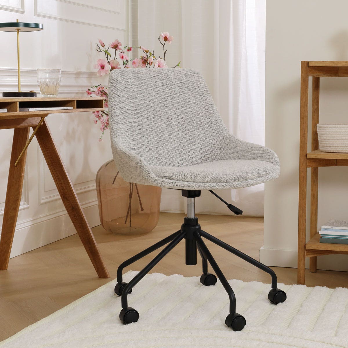 Deze design bureaustoel van Nolon is uitgevoerd in een gemêleerde beige stof, die een verfijnde uitstraling geeft en goed samengaat met verschillende interieurstijlen, zoals hotel chique of japandi. Het zwarte metalen onderstel met wielen maakt de stoel flexibel en gemakkelijk verplaatsbaar. Met een zithoogte van 46 cm en een zitdiepte van 40 cm is de stoel ontworpen voor comfort en ergonomie. Het Scandinavisch moderne ontwerp zonder armleuningen zorgt ervoor dat de stoel minder ruimte inneemt en onder elk bureau past. De zitting is volledig draaibaar, wat bijdraagt aan de functionaliteit. De stevige houten kern biedt de juiste ondersteuning voor je rug, terwijl de volledig gestoffeerde zitting een luxe zitervaring biedt. De stoel is eenvoudig in elkaar te zetten en biedt een perfecte balans tussen stijl en comfort voor het thuiswerken.