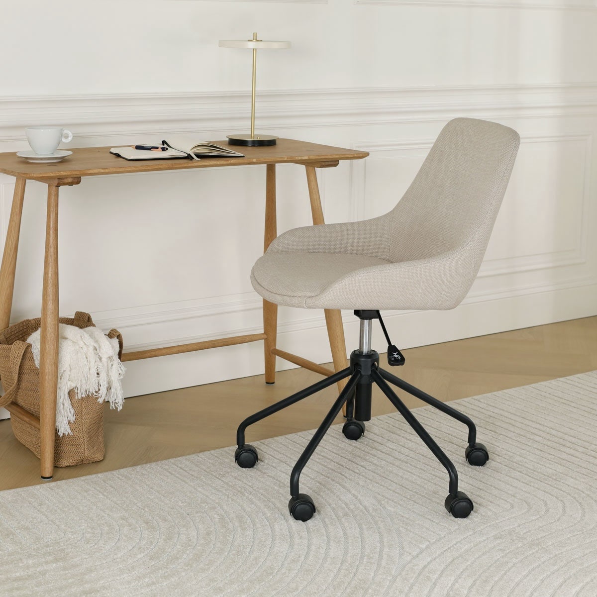 De Nout-Isa bureaustoel, met zijn elegante beige bekleding en zwart metalen onderstel, is de perfecte aanvulling voor elke moderne thuiswerkplek.