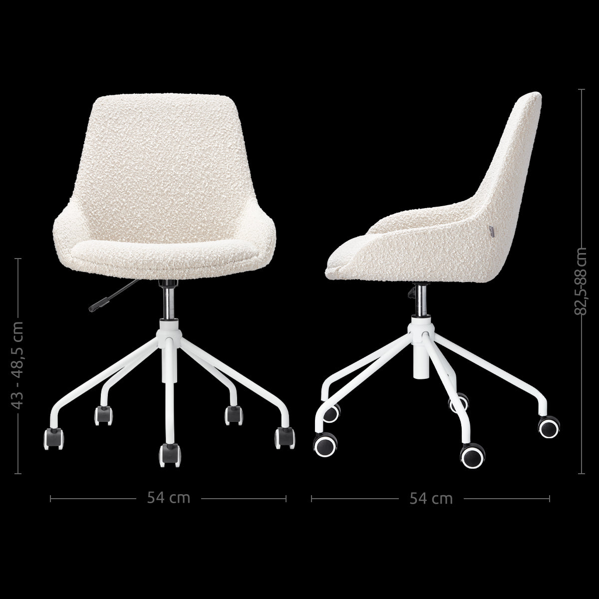 Het Scandinavische en trendy design zorgt ervoor dat deze stoel naadloos in elke werkomgeving past. Zonder armleuningen biedt deze stoel de vrijheid om je comfortabel te bewegen, terwijl de vijf metalen poten met zwenkwielen soepelheid en flexibiliteit bieden. De stoel is volledig gestoffeerd met een luxe bouclé stof die warmte en stijl toevoegt aan je interieur. Met een verstelbare zithoogte van 43 tot 48,5 cm is hij geschikt voor verschillende bureauhoogtes. Het witte onderstel is niet alleen visueel aantrekkelijk, maar ook functioneel dankzij de draaibare functie. Het sterke houten binnenwerk van de zitting biedt optimale rugondersteuning, wat ideaal is voor lange werkdagen. Deze bureaustoel is eenvoudig in elkaar te zetten en verkrijgbaar in diverse kleuren en materialen, waardoor hij aan te passen is aan jouw persoonlijke stijl en interieur. Met een zithoogte van 46 cm en een zitdiepte van 40 cm biedt de Nout-Isa bureaustoel een ergonomische zitervaring. Het metalen onderstel is ook verkrijgbaar in zwart, waardoor je nog meer keuzevrijheid hebt bij het samenstellen van jouw ideale werkplek.