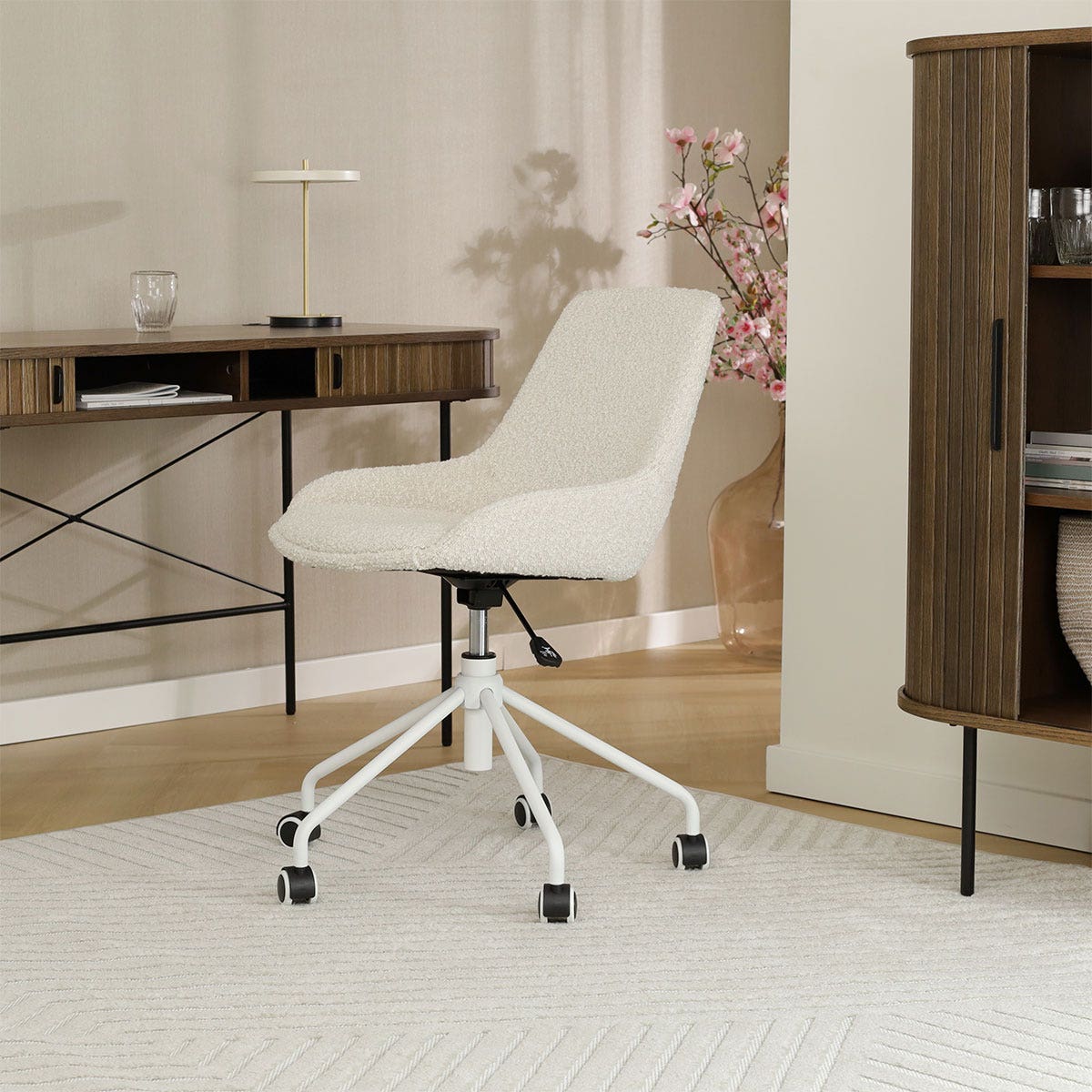 De Nout-Isa bureaustoel bouclé beige met wit onderstel is de perfecte toevoeging aan jouw thuiswerkplek.