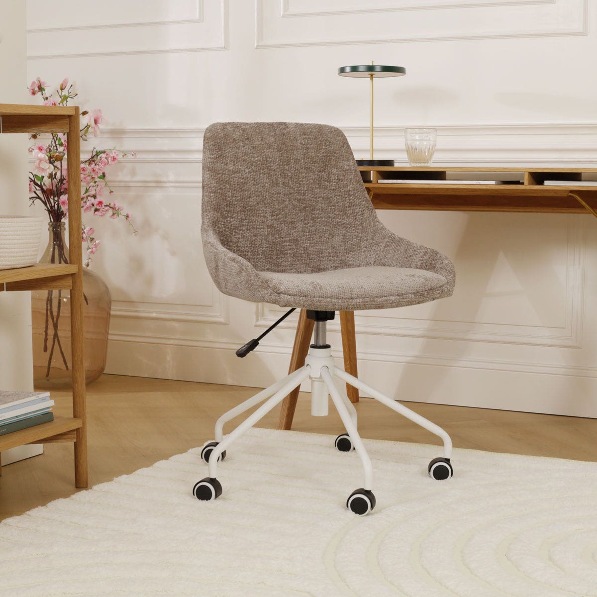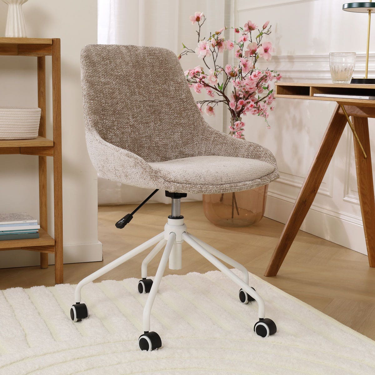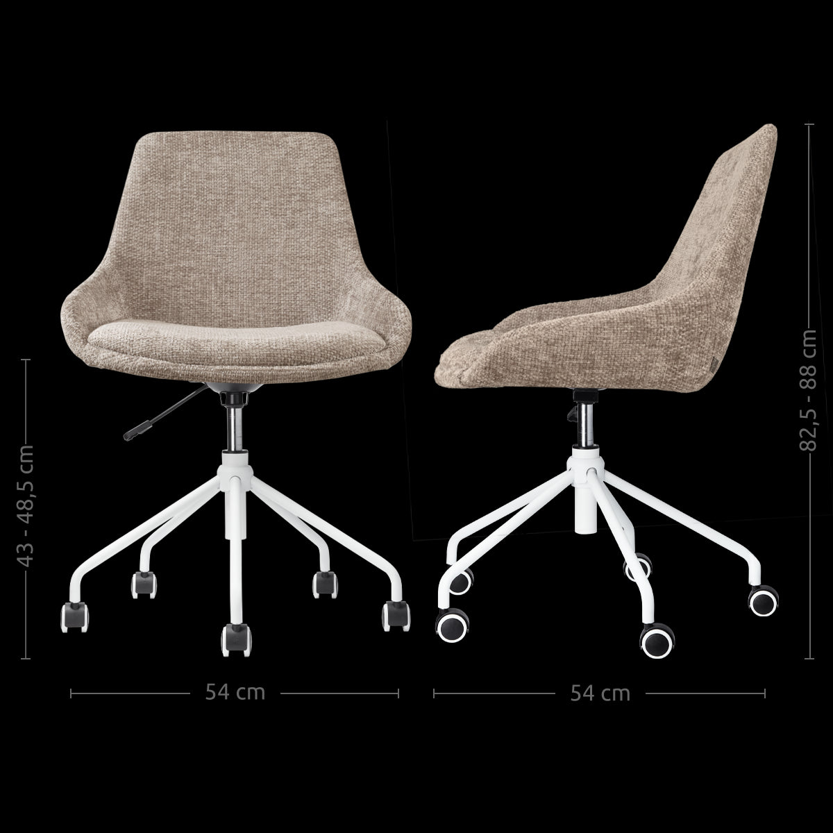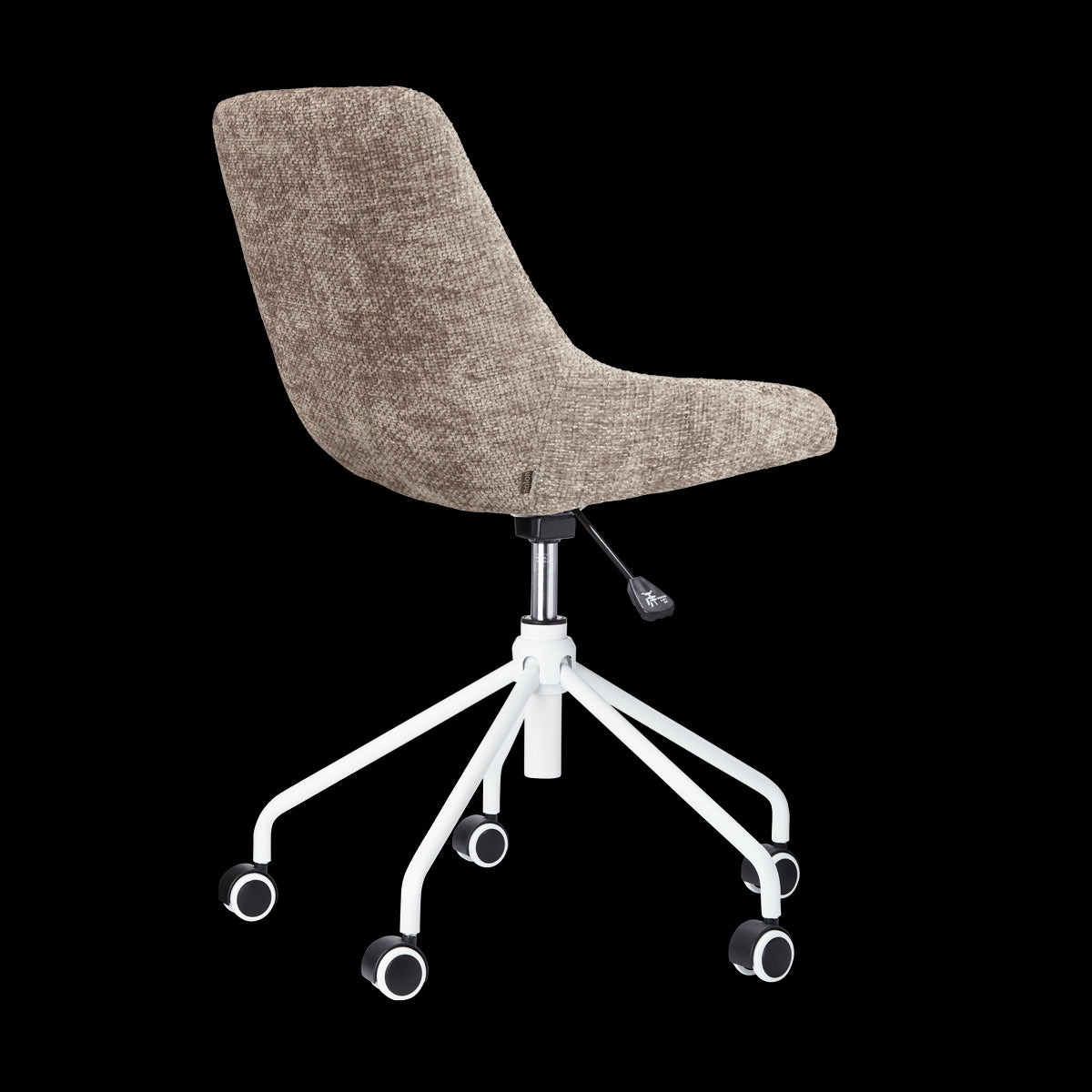 Ontdek de Nout-Isa bureaustoel, een perfecte aanvulling op je thuiswerkplek met zijn stijlvolle bruine zitting en wit metalen onderstel.
