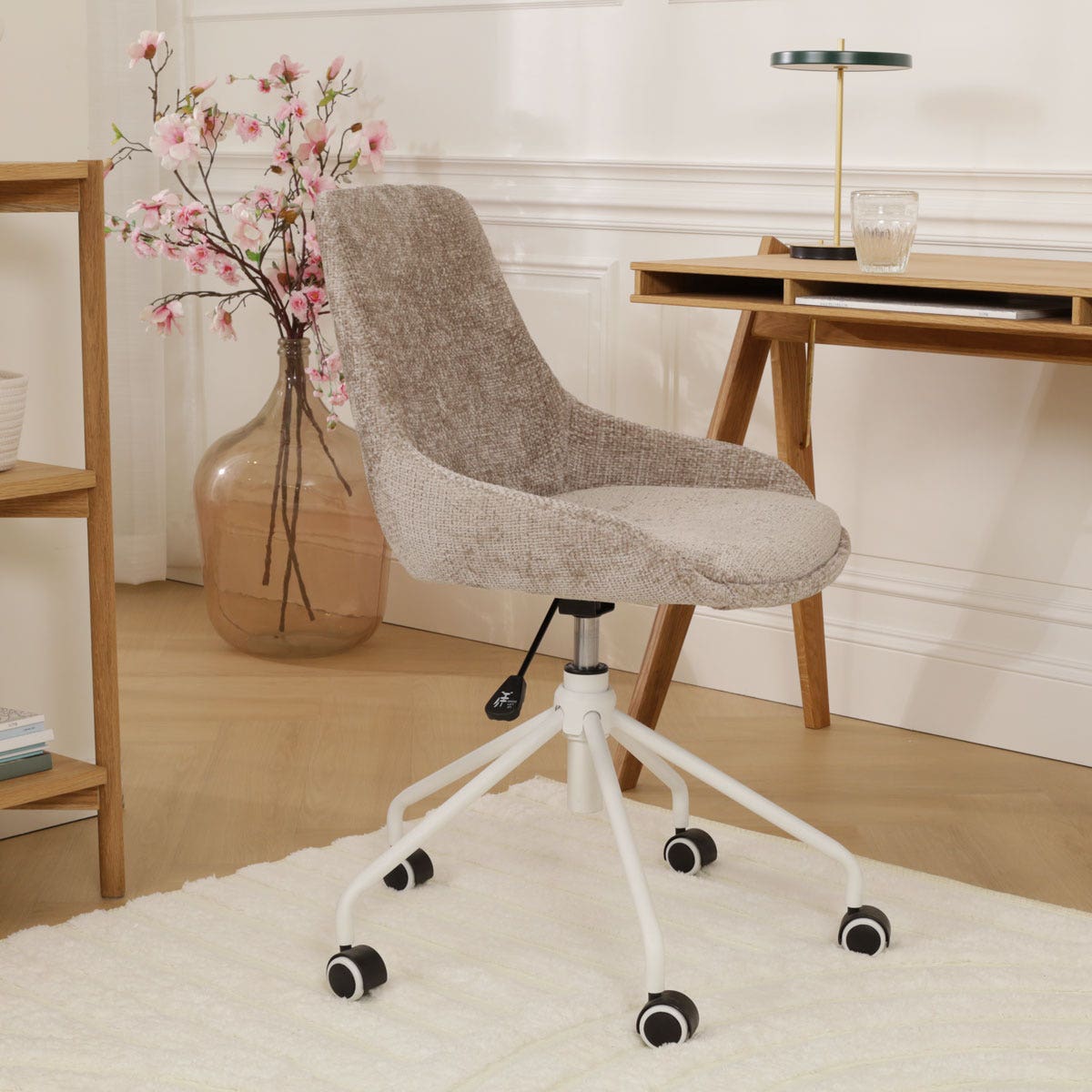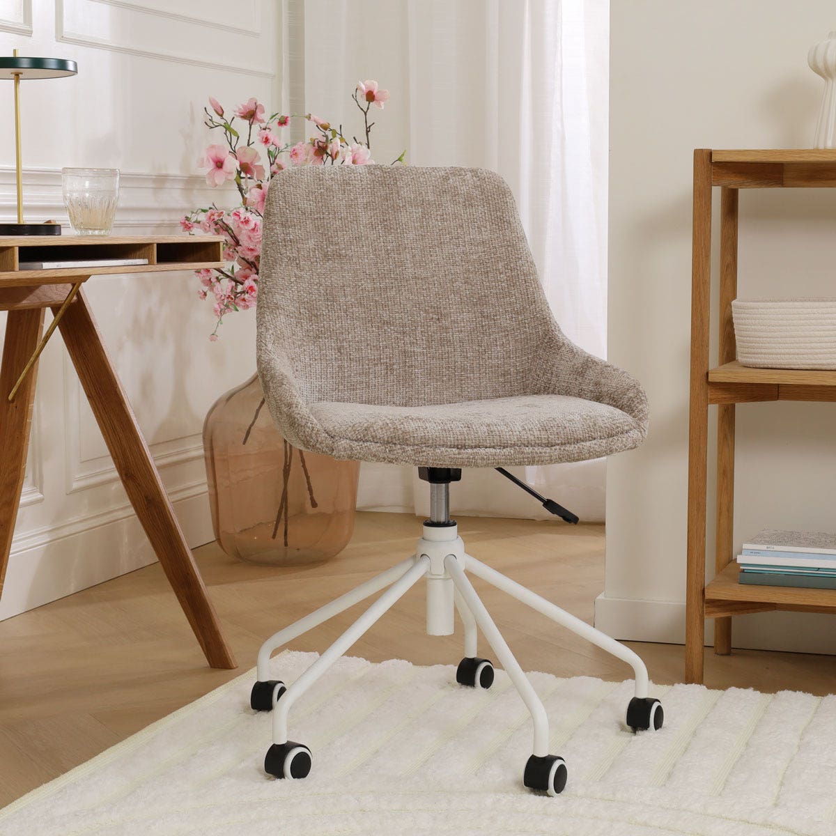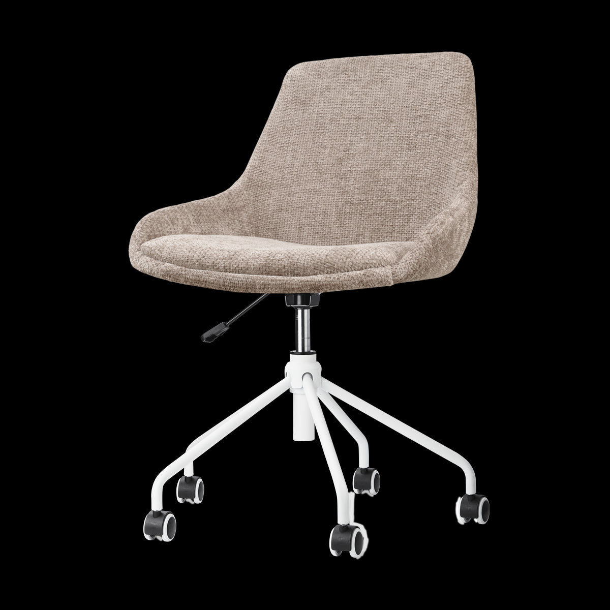 Deze moderne bureaustoel zonder armleuningen is ontworpen met Scandinavische invloeden en biedt zowel stijl als functionaliteit. De draaibare zitting is volledig gestoffeerd en biedt een uitstekende rugondersteuning dankzij de stevige houten kern, ideaal voor een actieve zithouding tijdens het werken. Met een verstelbare zithoogte van 43 tot 48,5 cm en een zitdiepte van 40 cm, kan de stoel eenvoudig worden aangepast aan je persoonlijke voorkeuren. Het witte onderstel met metalen poten en wieltjes zorgt voor mobiliteit en flexibiliteit, waardoor je gemakkelijk door je werkruimte kunt navigeren. De Nout-Isa bureaustoel is zeer eenvoudig in elkaar te zetten en maakt deel uit van een mix en match collectie, waardoor je de mogelijkheid hebt om de stoel naar eigen smaak aan te passen met verschillende zittingen en onderstellen. Met een totale hoogte van 86,5 cm en een zithoogte van 46 cm, past deze stoel moeiteloos onder elk bureau, zonder veel ruimte in te nemen. Deze veelzijdige bureaustoel is niet alleen praktisch, maar ook een stijlvolle toevoeging aan je interieur.
