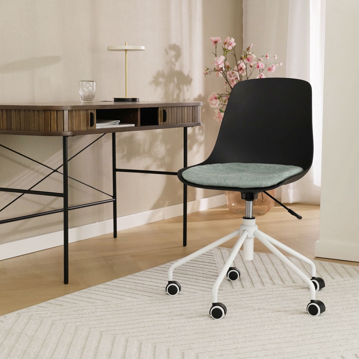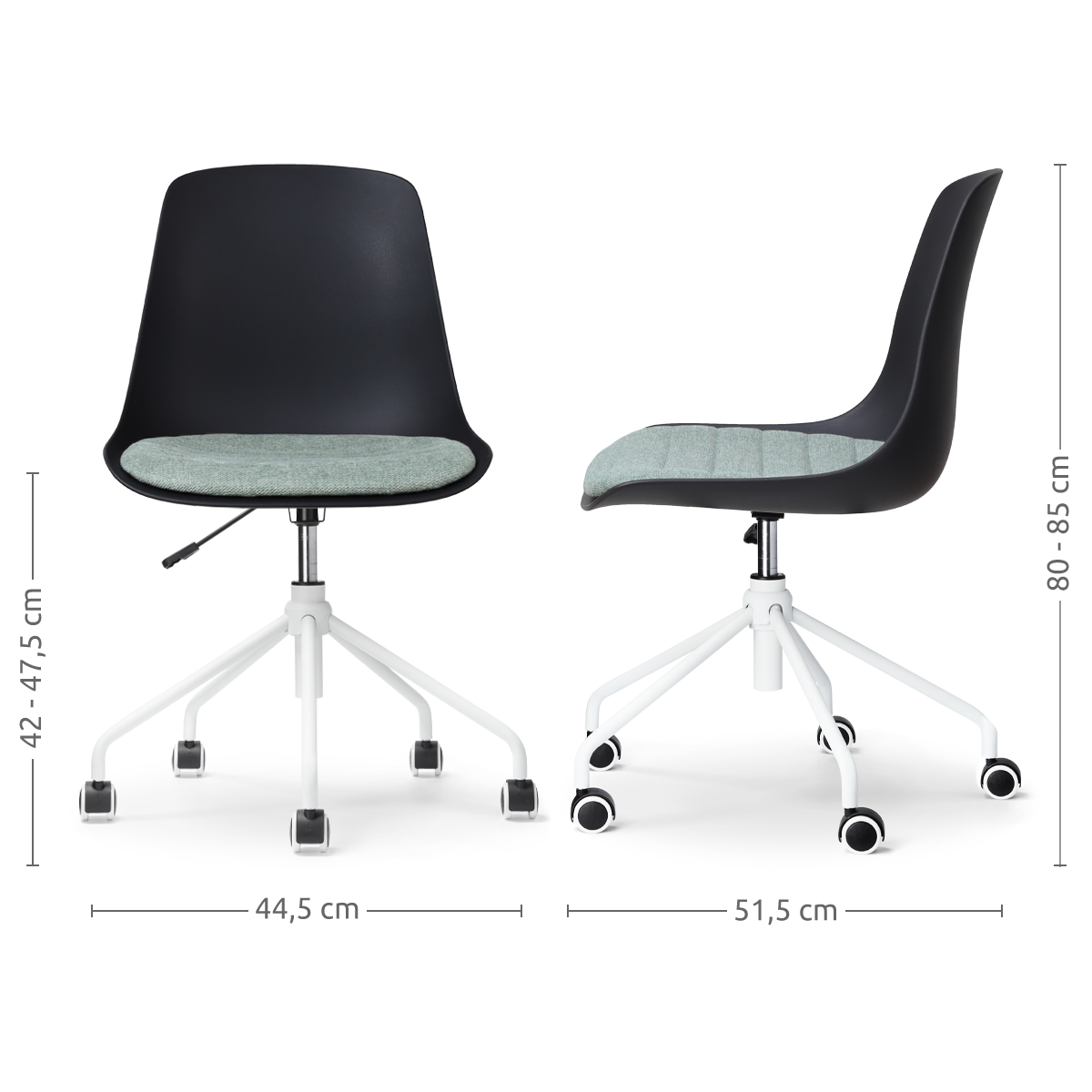 Dit moderne ontwerp heeft een duurzame kunststof zitting en een metalen onderstel met wieltjes. De zithoogte van de stoel is verstelbaar zodat je overal de juiste zithouding kan aannemen en de zitting draait 360 graden op het onderstel. De zitting is gemaakt van door en door gekleurd kunststof, waardoor de stoel zeer geschikt is voor intensief gebruik en bestand is tegen krassen en beschadigingen. Het vaste zitkussen is bekleed met zachte stof en zorgt ervoor dat je comfortabel zit je werken of studeren. Kies uit vijf verschillende kleuropties voor het vaste zitkussen en maak een keuze uit zwart en wit voor het onderstel en de kuipzitting. Zo kan je de Nout-Liv eetkamerstoel helemaal aan jouw interieurwensen aanpassen!