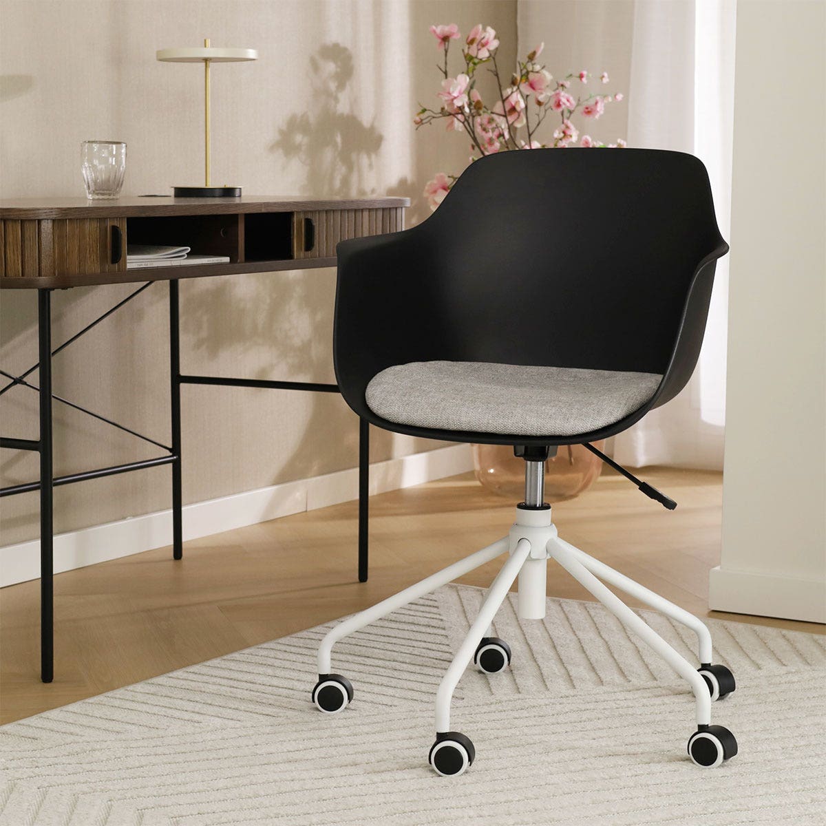De Nout bureaustoel van Nolon is niet zomaar een standaard bureaustoel. Nout is een moderne bureaustoel, waar je zeker wel op wilt (thuis) werken of studeren. De zitting van de bureaustoel is verkrijgbaar in het kunststof en je kunt kiezen uit verschillende kleuren vaste zitkussens in de stoel. Bovendien heeft de zitting armleuningen, voor net nog iets meer comfort. Het onderstel is gemaakt van metaal en is in hoogte verstelbaar. Kortom, een moderne bureaustoel, waarin je ook lekker zit tijdens lange vergaderingen.