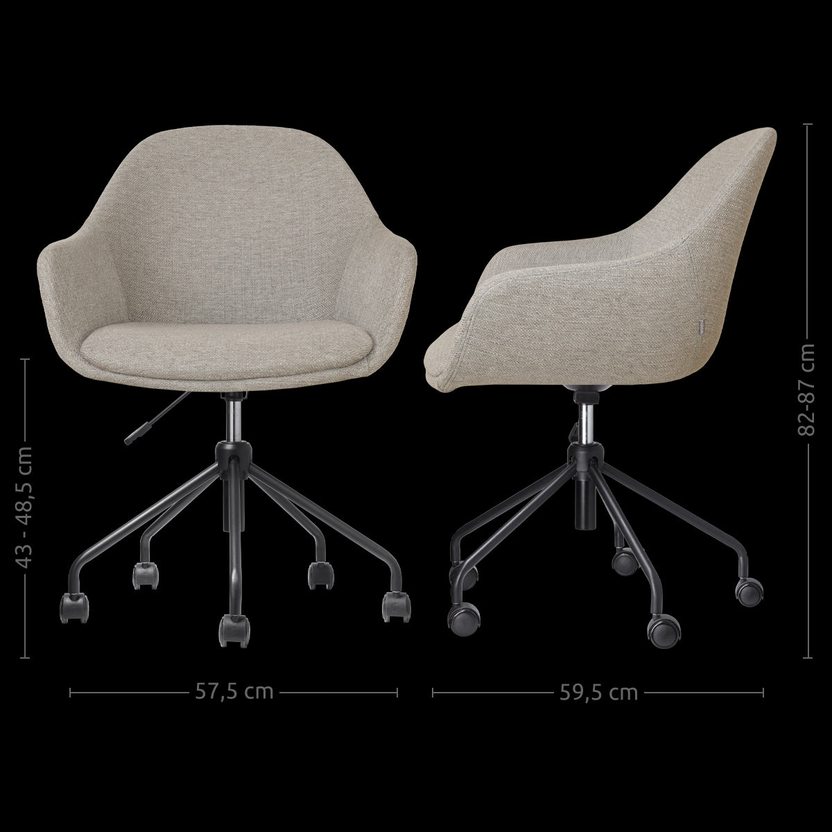 De Nout-Mae bureaustoel in warm grijs met zwarte poten combineert een strak Scandinavisch design met maximaal comfort. Deze bureaustoel is ontworpen voor wie stijl en functionaliteit zoekt in een werkplek. De luxe gestoffeerde zitting biedt niet alleen een uitnodigend zitvlak, maar heeft ook een ergonomische vorm die rug en armen optimaal ondersteunt. De schuin aflopende armleuningen zorgen ervoor dat je langdurig comfortabel kunt werken of studeren. Het stevige metalen onderstel met vijf zwenkwielen maakt de stoel wendbaar en geschikt voor verschillende vloertypen. Met de eenvoudig verstelbare zithoogte stel je de stoel perfect af op jouw bureau en houding. Dankzij de tijdloze combinatie van de warme grijze stoffering en de zwarte poten past de Nout-Mae moeiteloos in een modern interieur, of dat nu een thuiswerkplek of een kantoor is. Daarnaast is de stoel zeer eenvoudig in elkaar te zetten, zodat je snel aan de slag kunt.