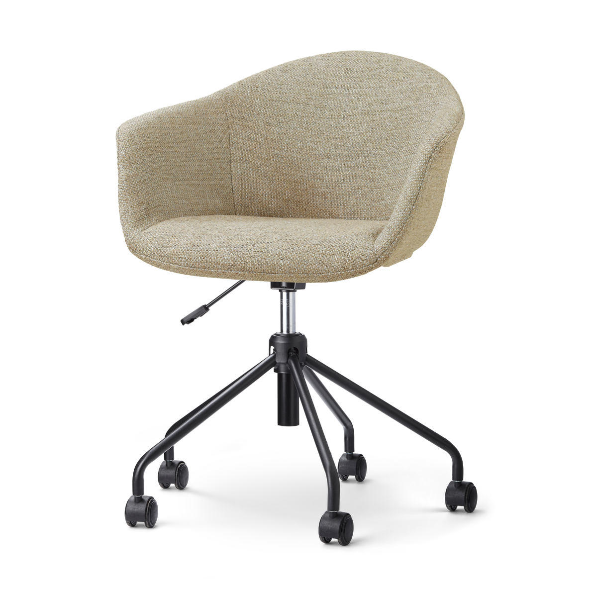 De Nout-Otis bureaustoel in taupe met zwarte poten geeft je werkplek een warme, moderne uitstraling. De zachte stof, ergonomische armleuningen en soepele wielen zorgen voor een comfortabele werkervaring. Het draaibare frame en de verstelbare zithoogte van 43 tot 38,5 cm maken de stoel zowel praktisch als elegant, ideaal voor thuiswerkers die van design houden.