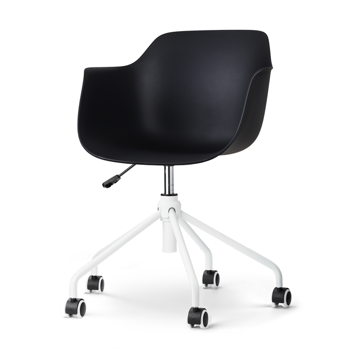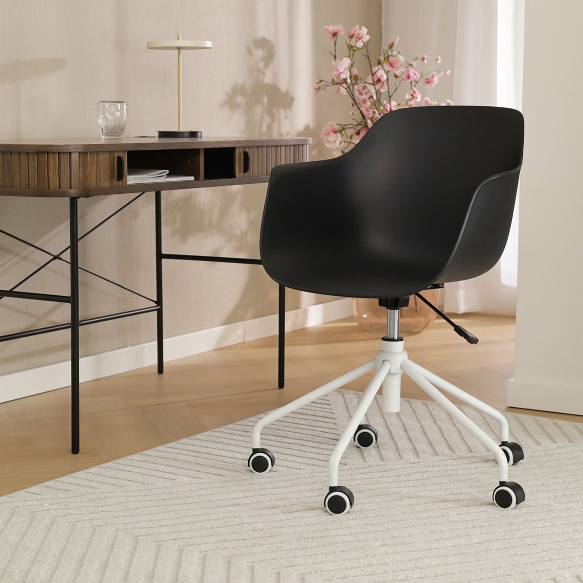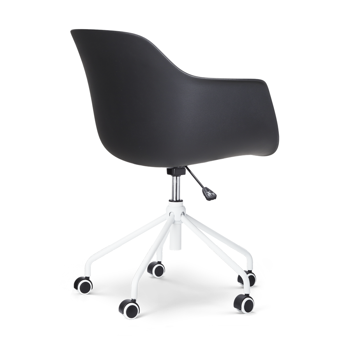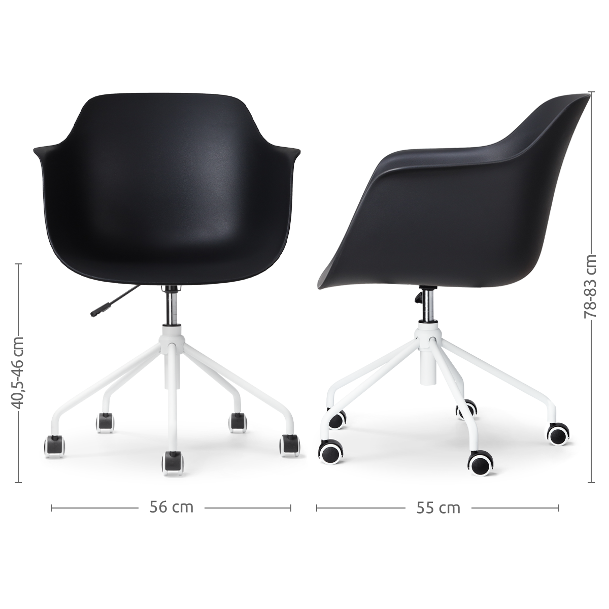 Deze bureaustoel, die een stoere en industriële uitstraling heeft, is uitgerust met een kunststof kuipzitting en stevige armleuningen die ultiem comfort bieden tijdens lange werkdagen. Het metalen onderstel met witte poten is niet alleen robuust, maar ook uitgerust met een handig verstelbaar mechanisme, zodat je de zithoogte naar wens kunt aanpassen van 40,5 cm tot 46 cm. De stoel is draaibaar en heeft een zithoogte van 46 cm en een zitdiepte van 46 cm, wat zorgt voor een comfortabele en ergonomische zitpositie. Met een totale hoogte van 82 cm past deze Scandinavisch geïnspireerde bureaustoel perfect in verschillende interieurstijlen. Verkrijgbaar in een strakke zwart-witte combinatie, maakt de duurzame en onderhoudsvriendelijke afwerking van de kunststof zitting deze stoel een praktische en stijlvolle toevoeging aan je kantoor of thuiswerkplek.