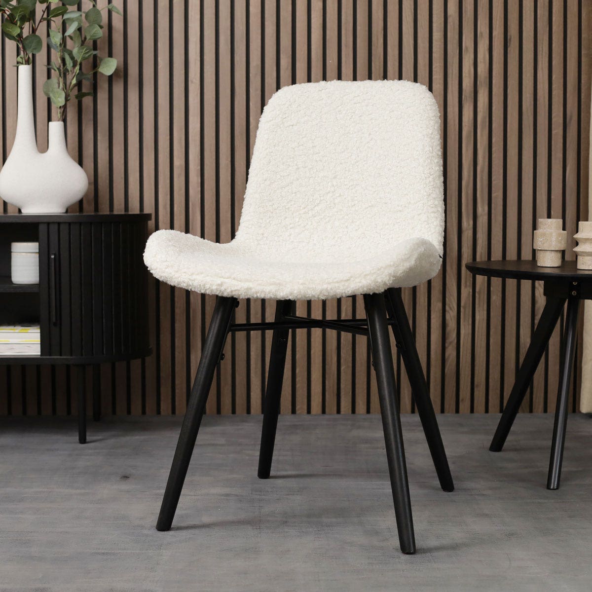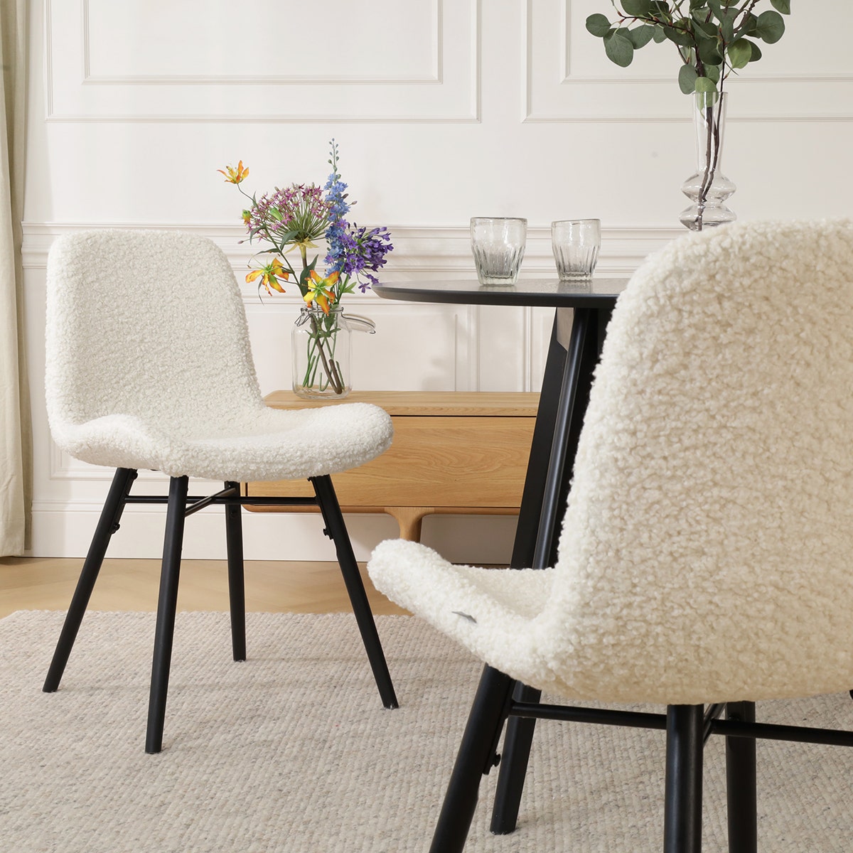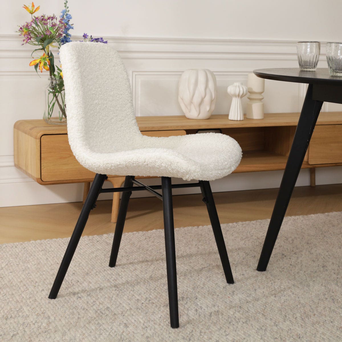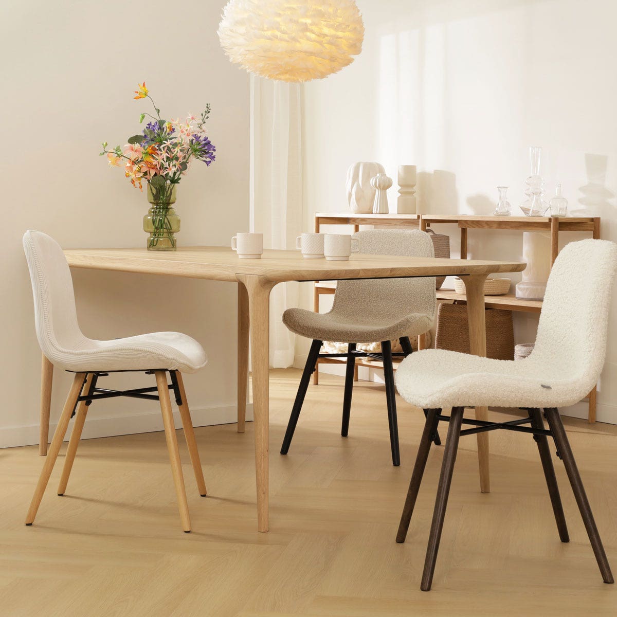 Het robuuste onderstel van deze stoel zorgt voor een stoere en industriële touch in het ontwerp. De poten zijn gemaakt van metaal, hebben een taps-toelopende vorm en zijn voorzien van een kruisverbinding tussen de poten voor extra stabiliteit. De zitting heeft een stoffen bekleding en is ontworpen met een gevleugeld zitvlak, wat een zacht en comfortabel oppervlak biedt om op te zitten. Net als andere eetkamerstoelen zonder armleuningen geeft de Nova-Fé je de vrijheid je stoel gemakkelijk onder de eettafel te schuiven. Kies uit een assortiment van prachtige kleuren en verschillende materialen voor de stoffen bekleding, waaronder teddystof, ribstof en bouclé, om jouw eethoek een sfeervolle upgrade te geven. Wil je liever een stoel met een meer natuurlijke uitstraling? Bekijk dan eens de combinaties van de Fé zitting met het houten Nena onderstel van Nolon.