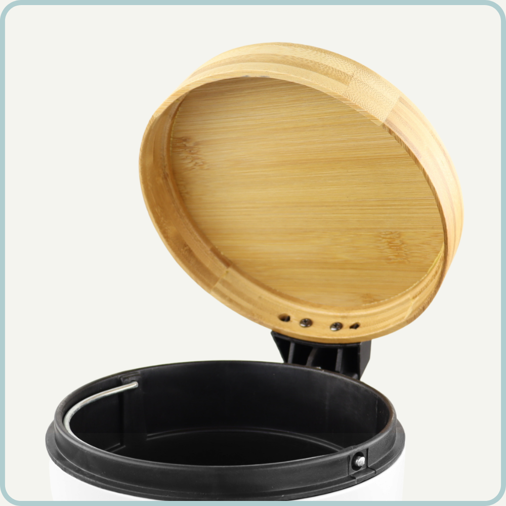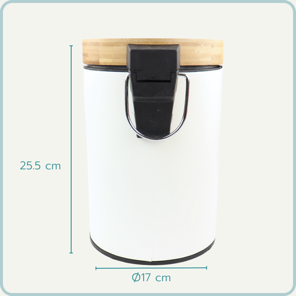 De prullenbak van NORDIX is geschikt voor 3 L aan afval. Het is een pedaalemmer en wordt niet geleverd met zakken. De prullenbak is rond van vorm en is wit van kleur. De pedaalemmer is gemaakt van metaal en bamboe.