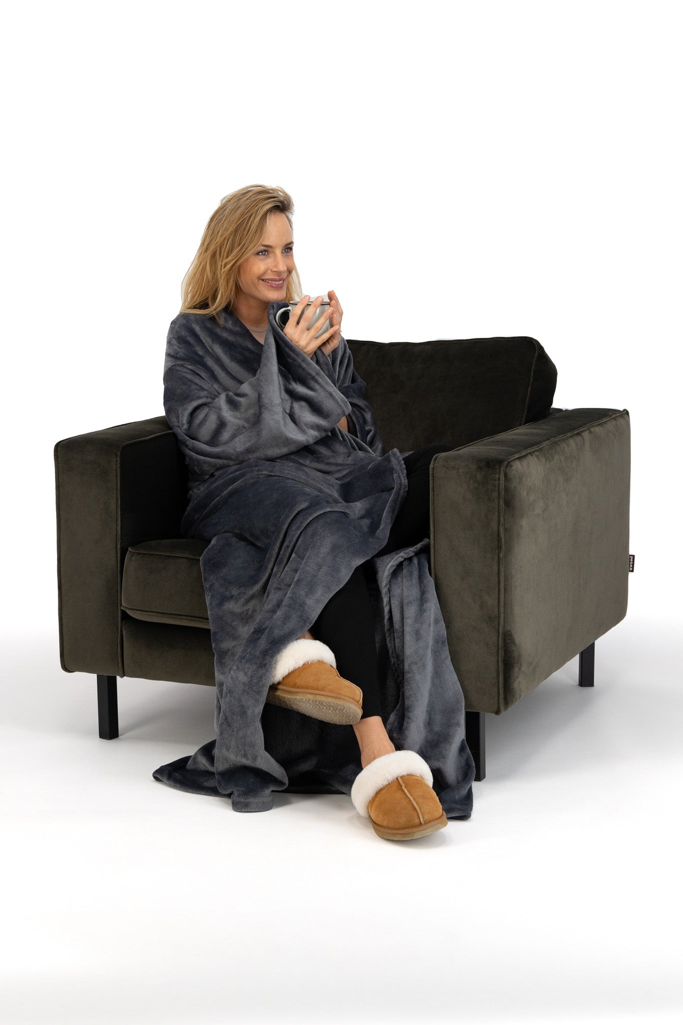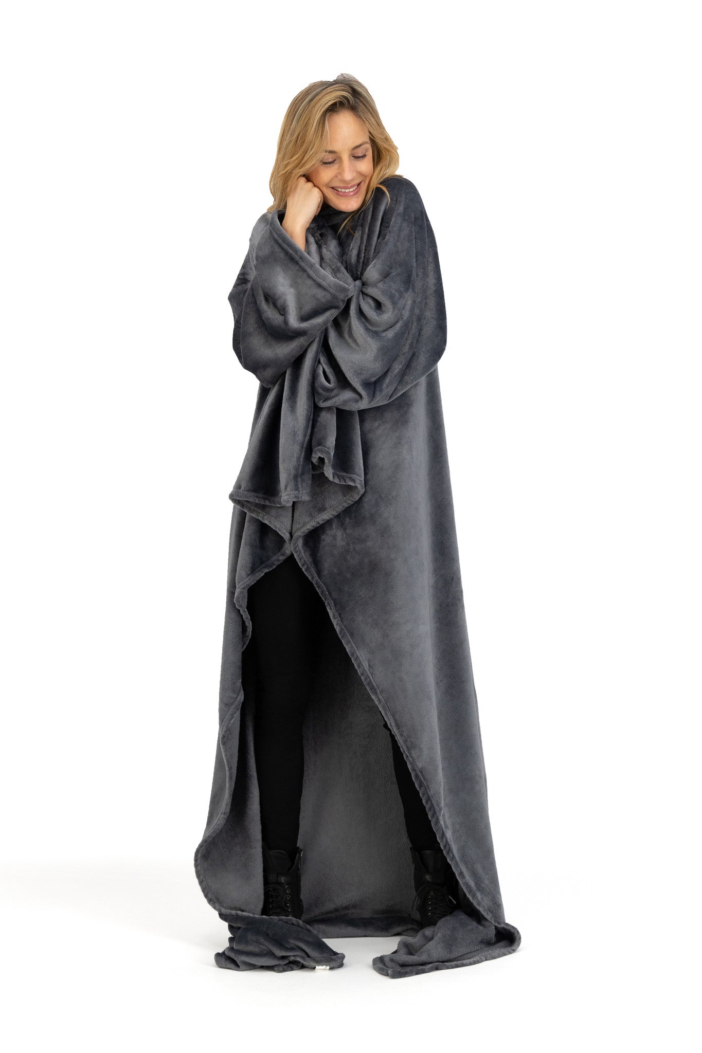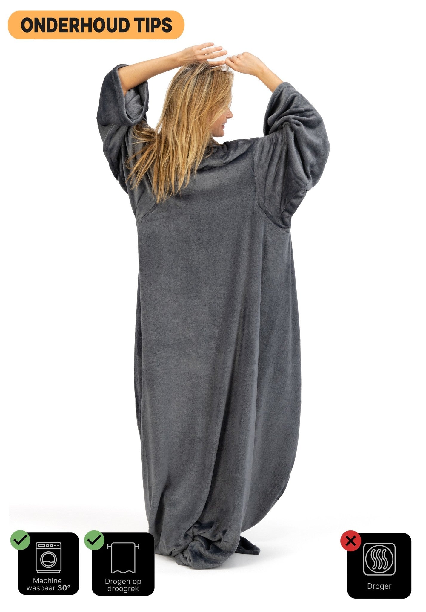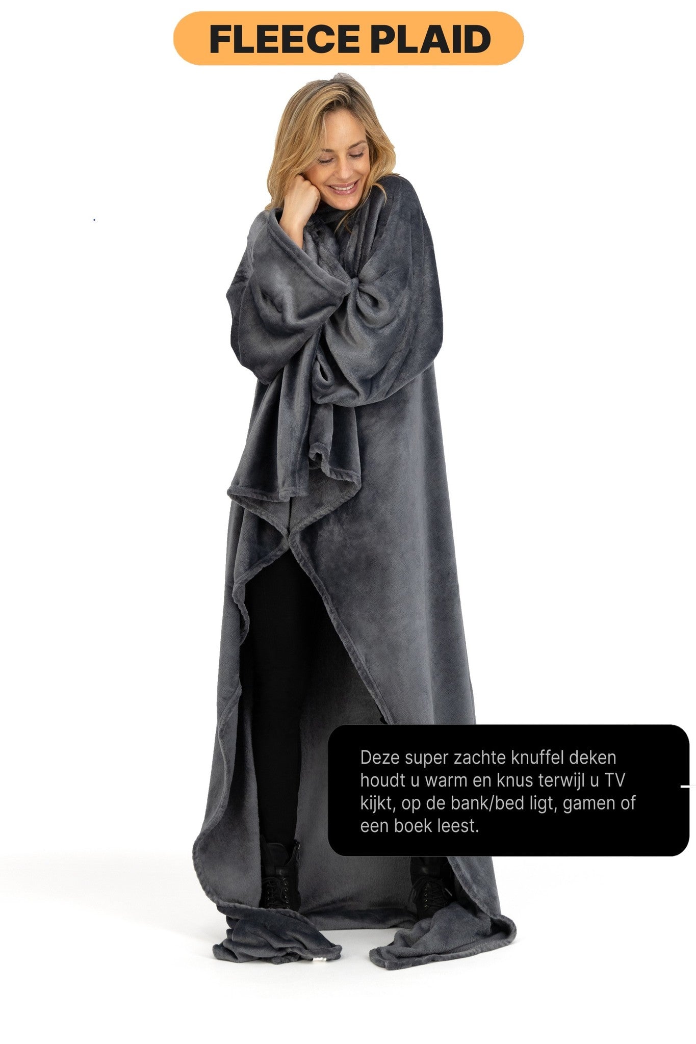- Met mouwen: Zodat je makkelijk kan drinken en eten zonder dat je onder de warme deken uit hoeft.
