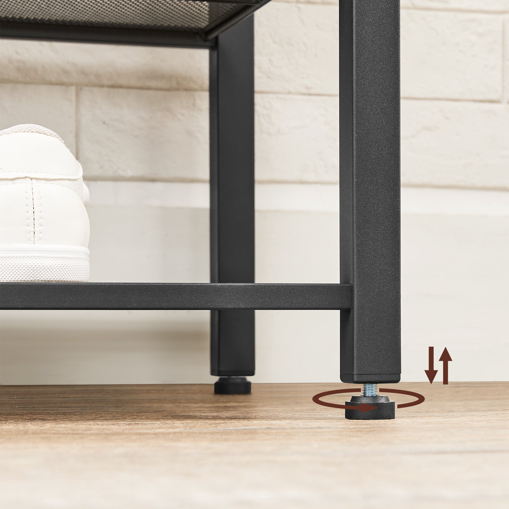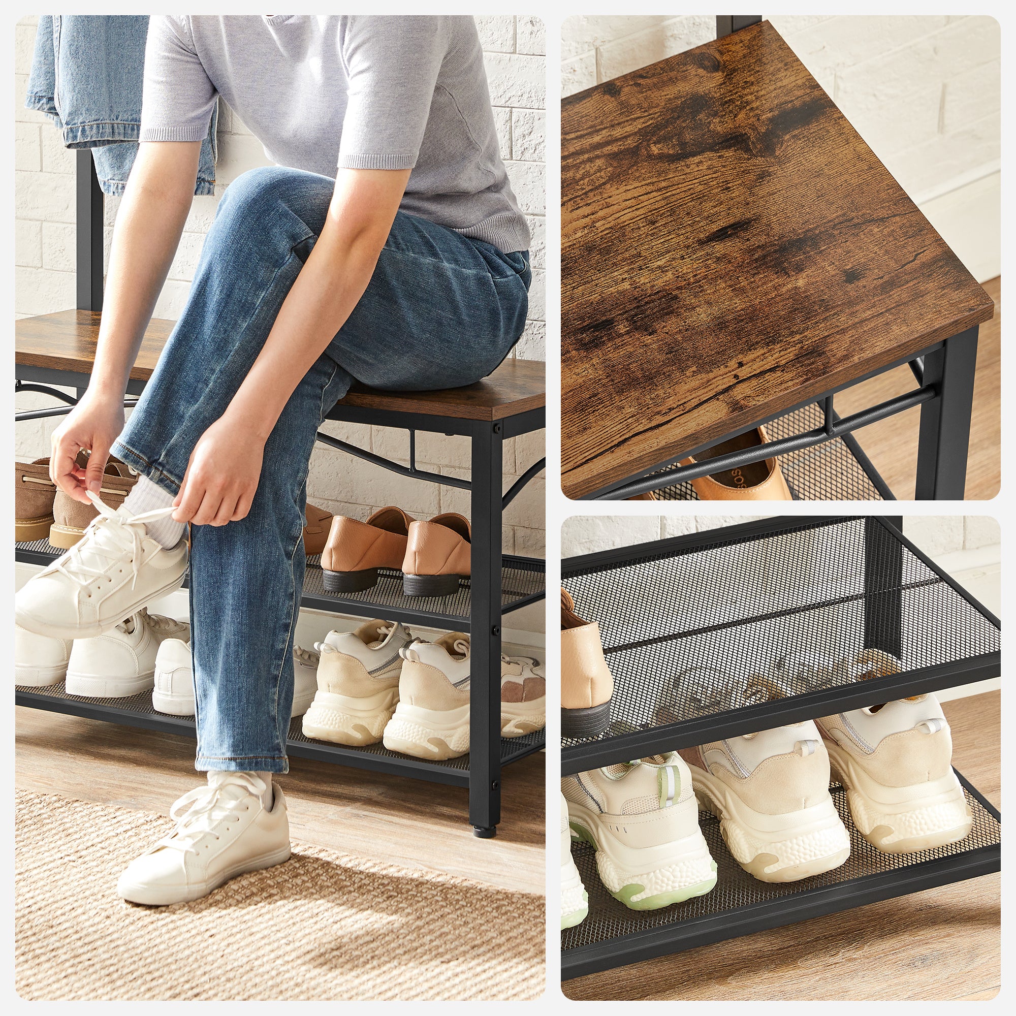 STABIEL EN VEILIG: Met vier verstelbare pootjes kan het garderobe perfect op het tapijt of op een oneffen ondergrond staan; 2 anti-omval bandjes zijn bijgevoegd om en te zorgen voor een veilig gebruik. Robuuste metalen buizen met een matte afwerking en MDF in vintage stijl maken de schoen bank sterk en stabiel, kan makkelijk een volwassenen persoon houden; de houten bank kan tot 100 kg dragen. (TIP: bevestig de staande kapstok aan de muur met de bijgeleverde anti-tip kit).