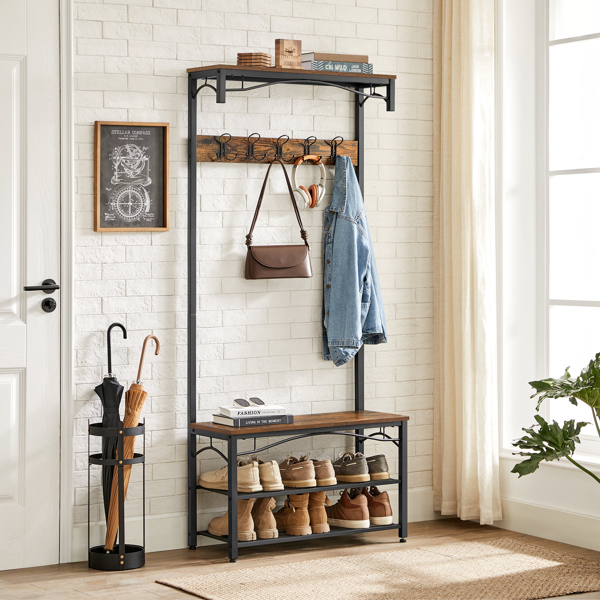 Garderobe rek met plaats voor hoeden en mutsen. Een kapstok, schoenenrek, bank met planken, 15 haken en een metalen frame met matte afwerking. Deze elegante kapstok zorgt voor een opgeruimde gang; Een tijdloos design met strakke lijnen en de rustieke uitstraling geeft je huis een moderne en elegante charme. Je werk de hele dag, kom naar huis en hangt je jas, muts en sjaal aan van de 5 dubbele haken, dan ga je zitten op de comfortabel bank om je schoenen uit te doen en leg deze op twee metalen rekken die onder je staan, makkelijker kan niet!