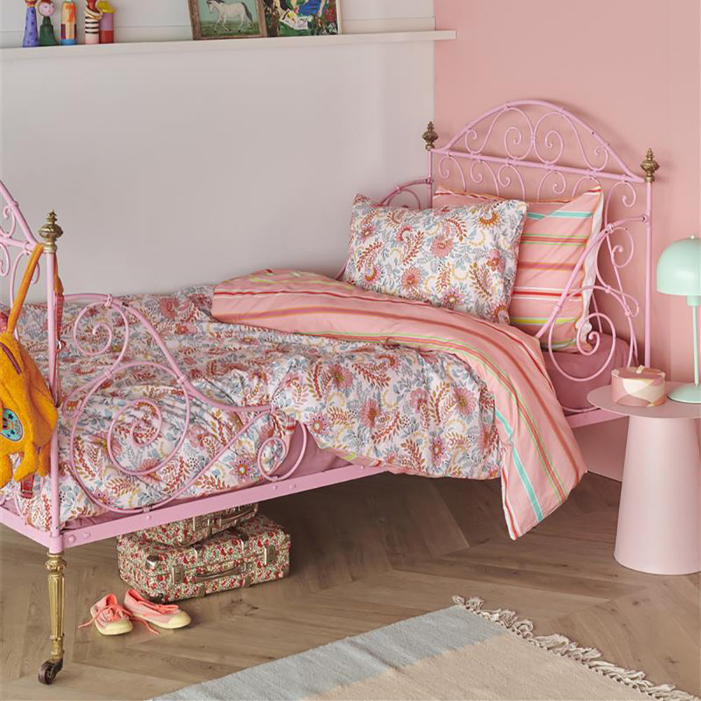 Waarom dekbedovertrek Rubu? Ruby is een vrolijk kinderdekbedovertrek dat bestaat uit een kleurrijke bloemenprint. De paisley bloemen zijn afgebeeld op een lichtroze ondergrond. De andere zijde heeft een speels getekende strepenprint in de trendykleuren roze, oranje, groen, geel , blauw en rood. Hierdoor zijn beide zijdes als voorkant te gebruiken. Het kussensloop heeft hetzelfde dessin als het dekbedovertrek.