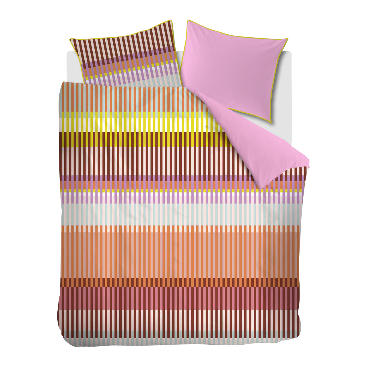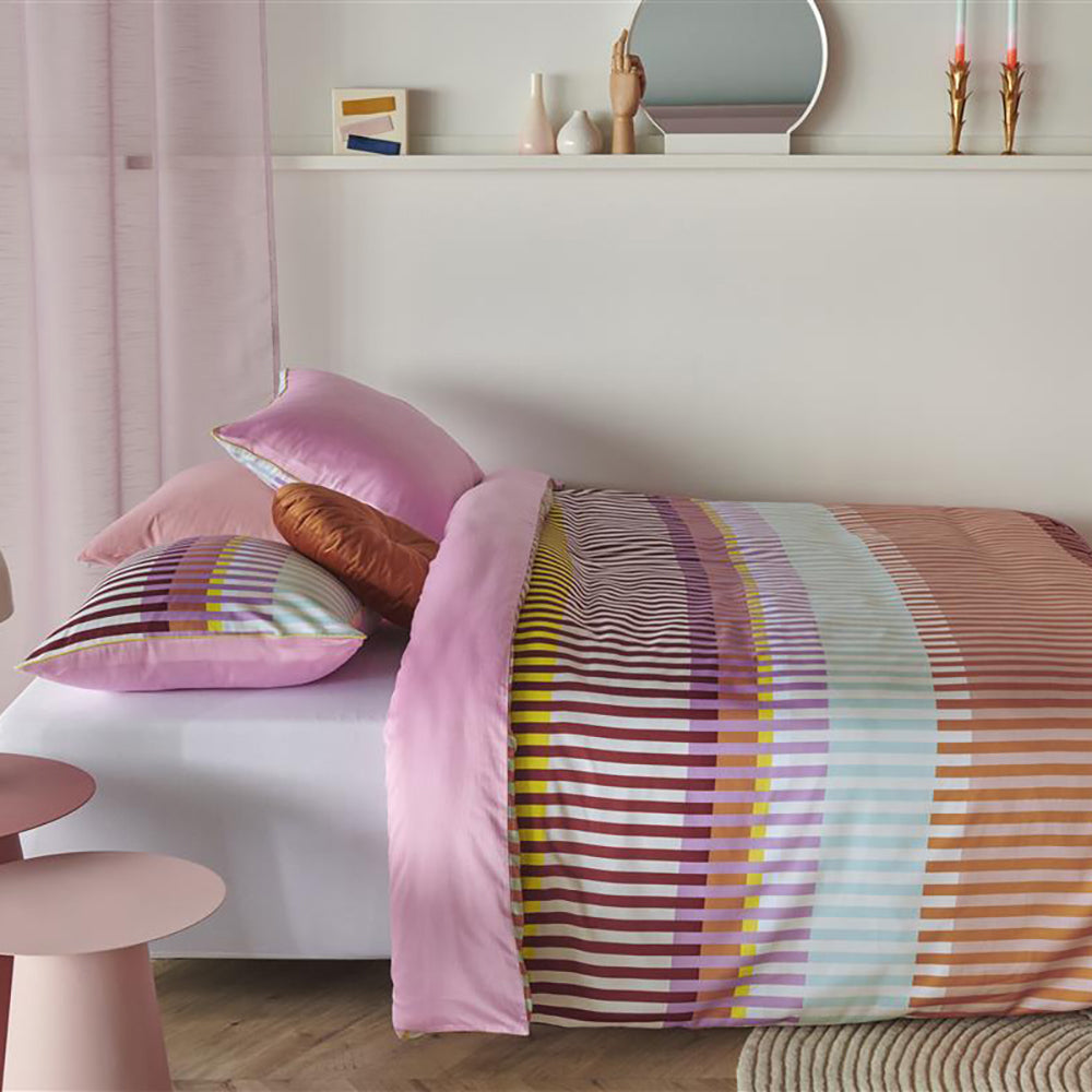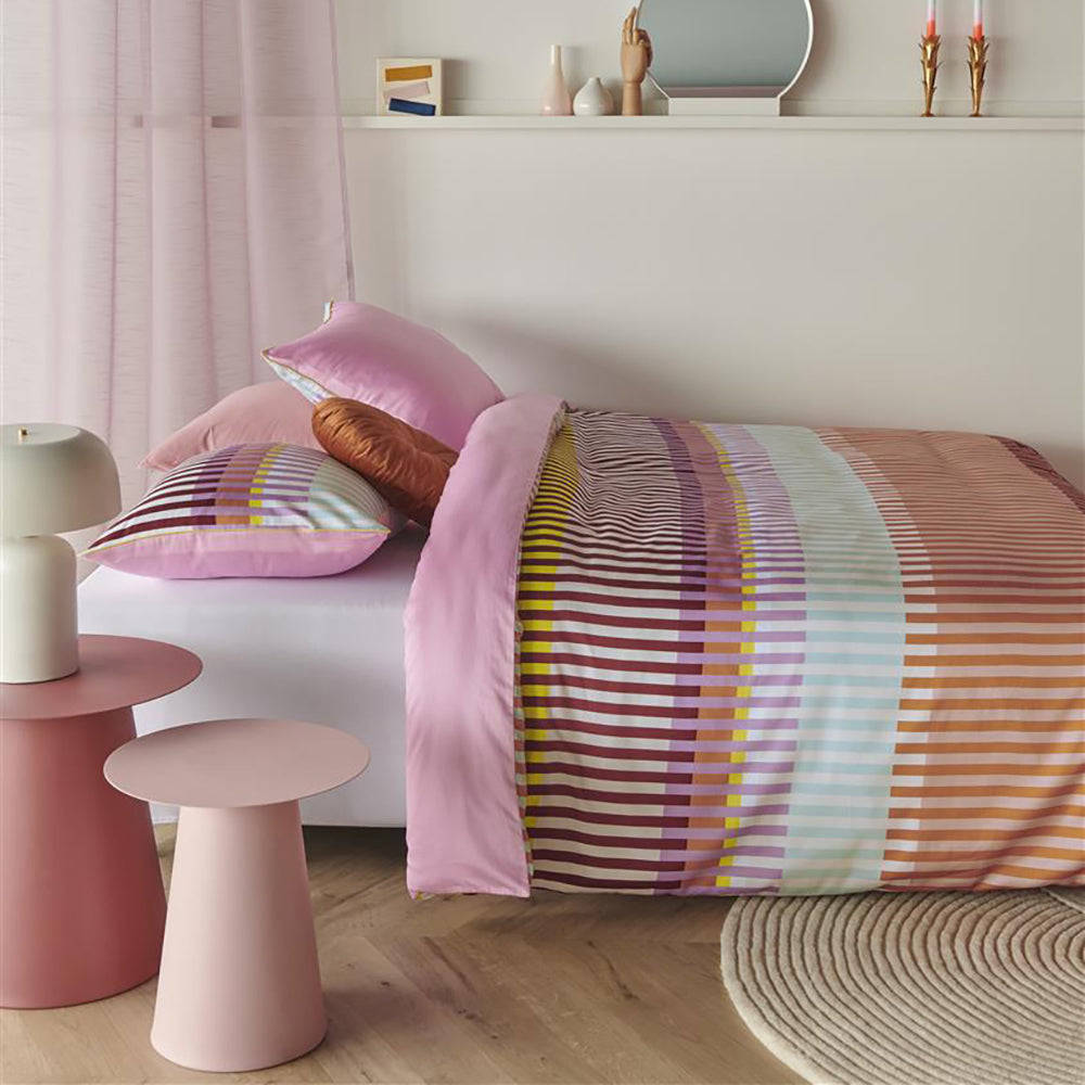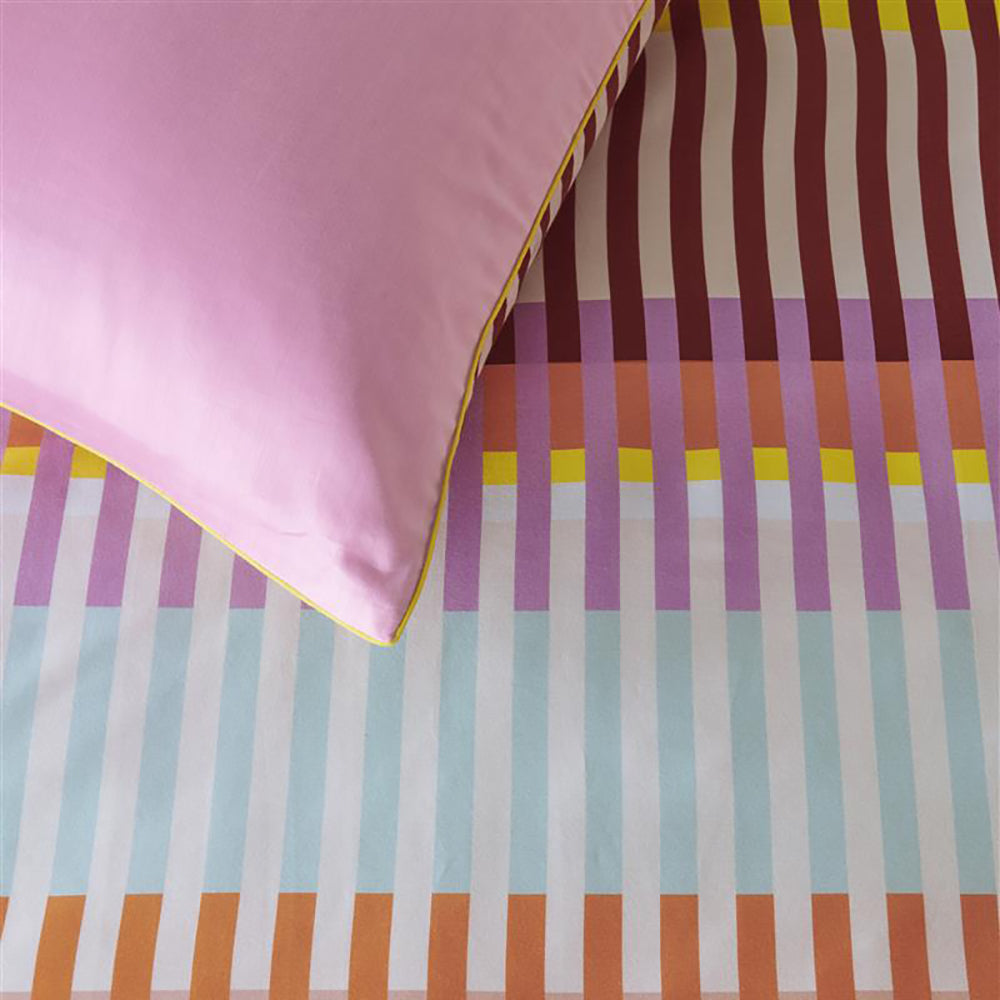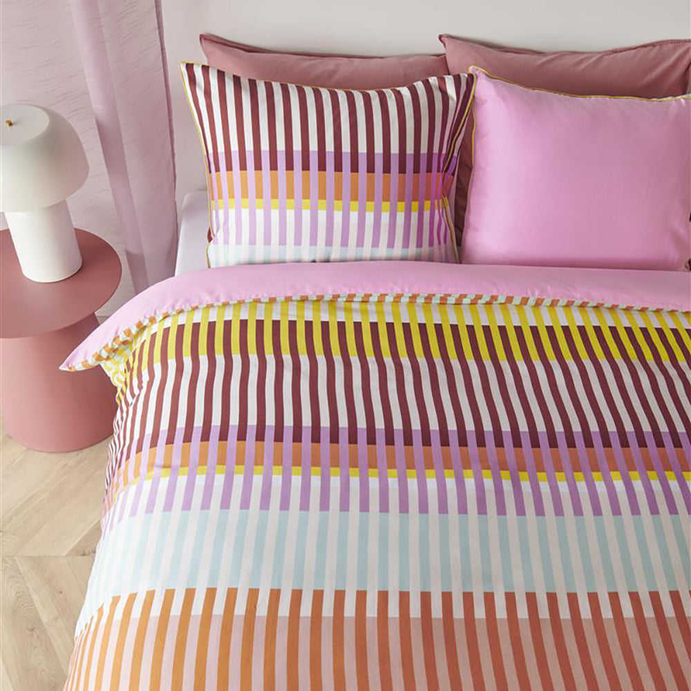 Waarom dekbedovertrek Vague? Het dekebdovertrek Vague Multi is een trendy grafisch banendessin, dat is opgebouwd uit diverse verticale strepen. De kleuren oranje, turquoise, blauw, groen, paurs, aubergine, roze, peach en off-white wisselen elkaar af. De achterkant van het overtrek heeft een effen roze kleur. Het kussensloop heeft hetzelfde dessin als het dekbedovertrek en is afgewerkt met een contrasterende gele bies. Oilily bedtextiel staat bekend om unieke kleurcombinaties, vrolijke patronen, rijke en bijzondere prints en vakmanschap.