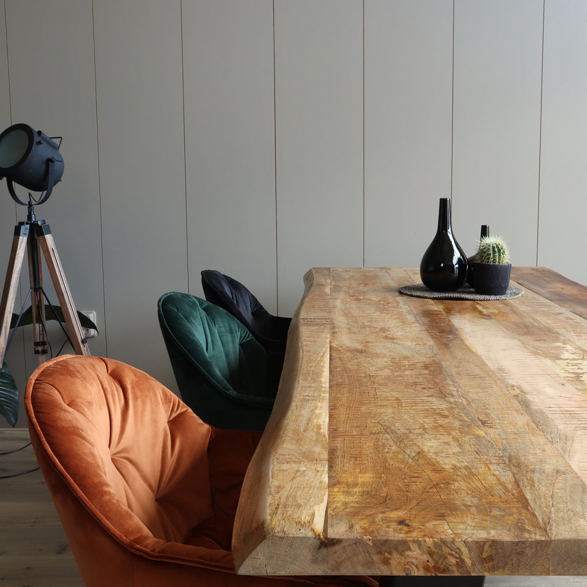 Eettafel blad boomstamtafel rechthoekig voor 8 personen van massief mangohout met een bladdikte van 4cm.