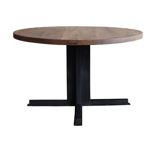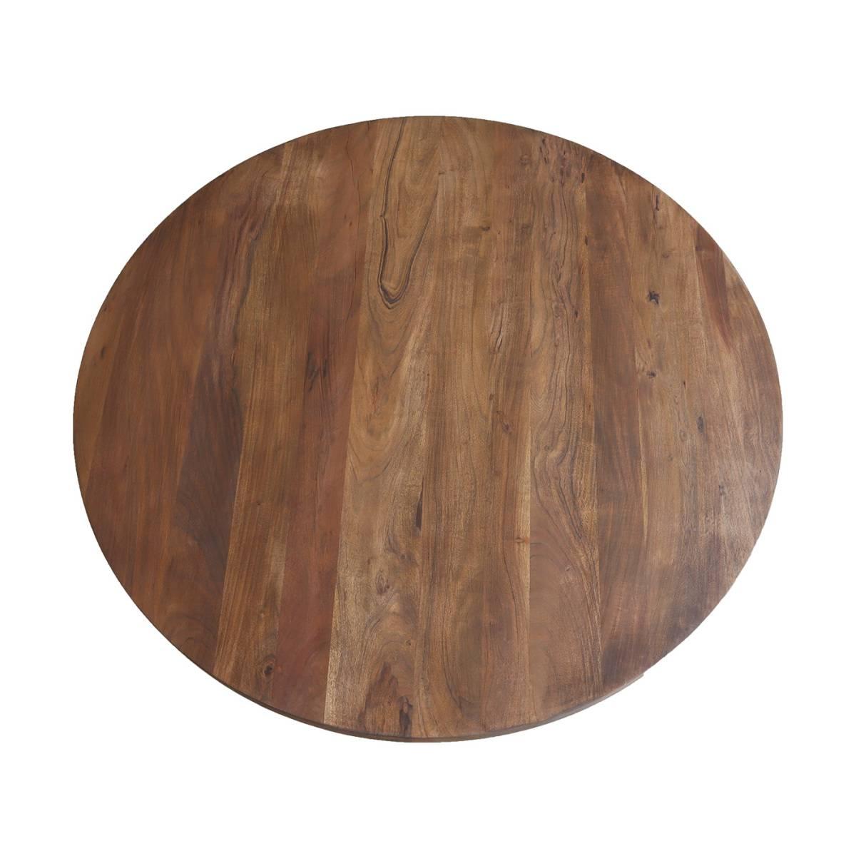 Ronde eettafel voor 5 personen met een tafelblad van onbewerkt acacia hout. De eettafel heeft een industriële uitstraling dankzij het prachtige tafelblad van onbewerkt acacia hout en de zwart metalen sterpoot.