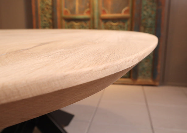 Eetkamertafel industrieel ovaal met schuin afgewerkt tafelblad. Het mooie schuin afgewerkte blad is van onbehandeld eikenhout en is 4cm dik.