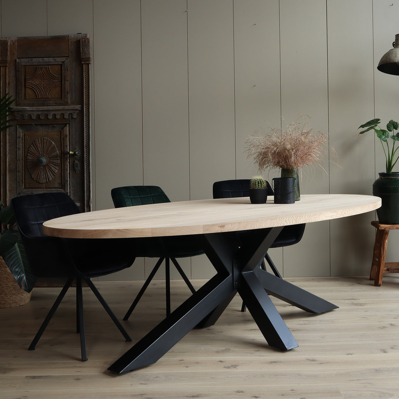 Industriële ovale eettafel van onbehandeld eikenhout ✓ Type tafel: Eetkamertafel ✓ Vorm tafelblad: Ovaal Almond, Spits Ovaal ✓ Materiaal tafelblad: Massief eikenhout ✓ Kleur tafelblad: Naturel, lichtbruin ✓ Afwerking tafelblad: Onbehandeld ✓ Dikte tafelblad: 4cm ✓ Type onderstel: Spinpoot ✓ Materiaal onderstel: Metaal ✓ Kleur onderstel: Zwart ✓ Aantal personen: 6 ✓ Lengte x Breedte x Hoogte: 240x110x76cm ✓ Merk: Old Inn Wonen