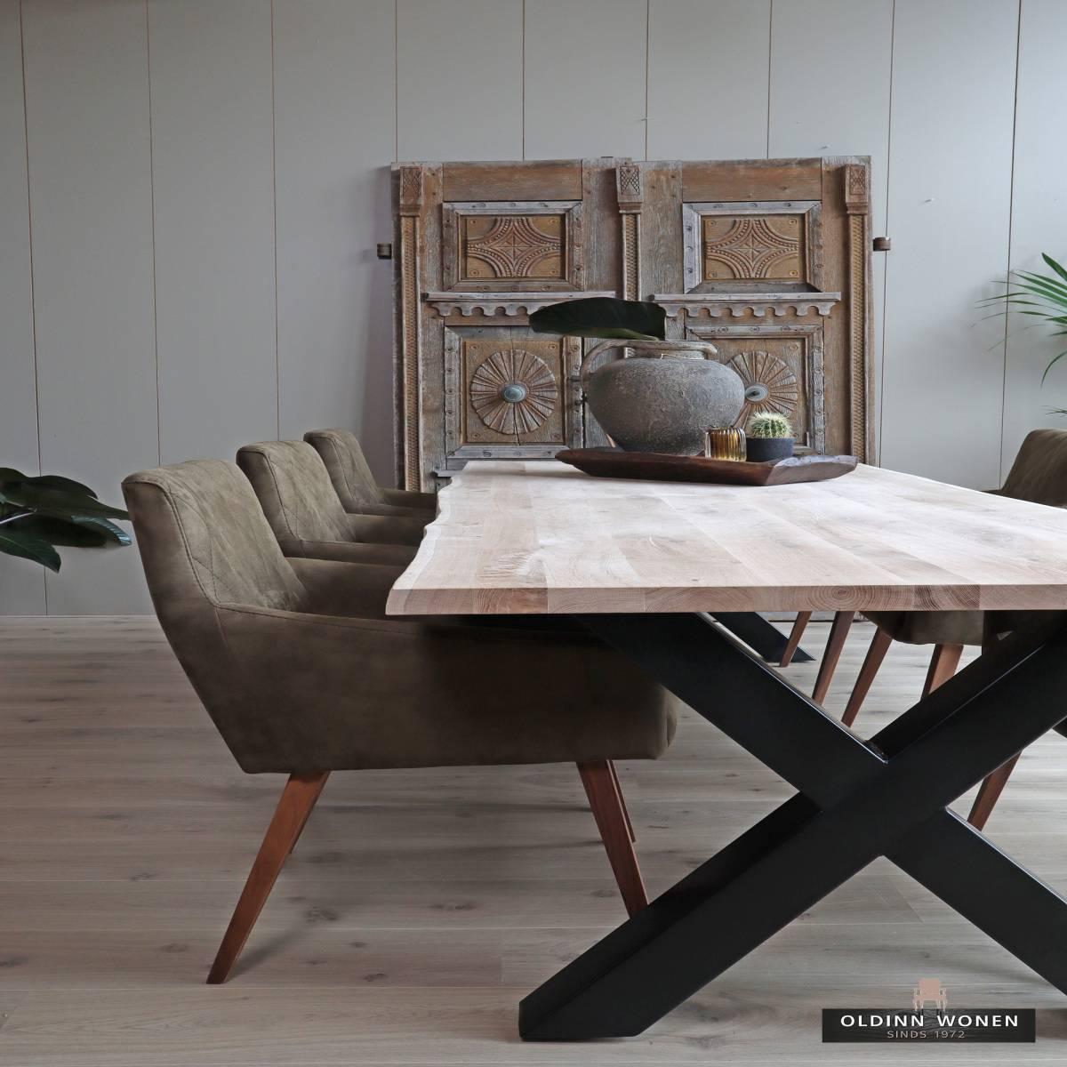 Het eikenhout in combinatie met een zwarte metalen X-poot geeft de tafel een landelijke en industriële uitstraling. Het tafelblad heeft aan de onderzijde van stalen strips die helpen voorkomen dat het blad gaat werken.