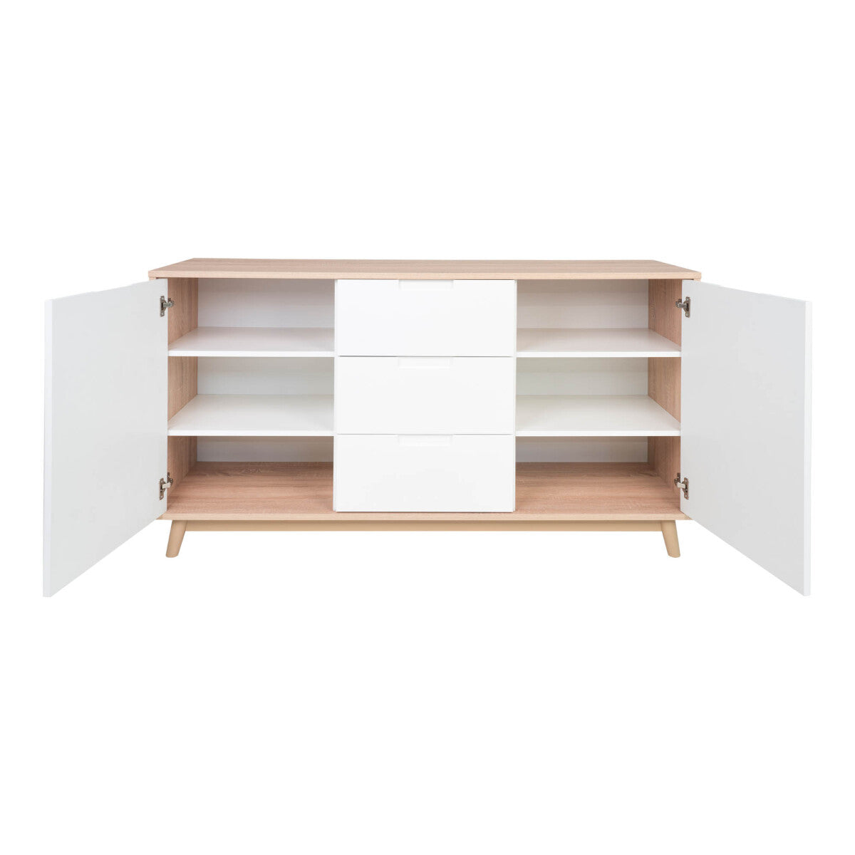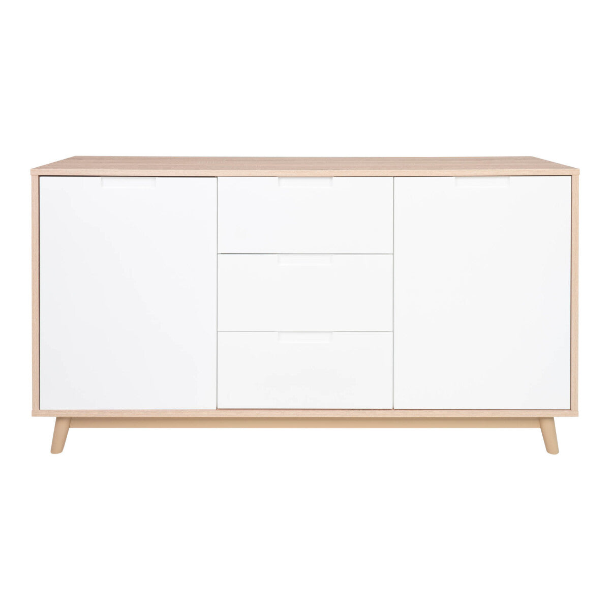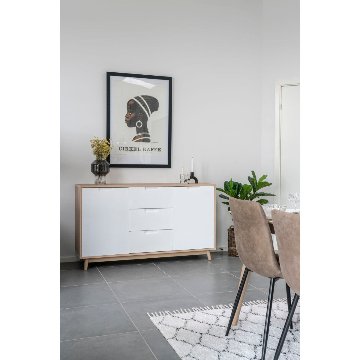 Dit prachtige industriële wit/blank houtkleurige mdf dressoir van Old Inn Wonen is een echte toevoeging aan je interieur! Het mooie dressoir van mdf met blank houten mdf pootjes is 150cm breed, 45cm diep en 150cm hoog.