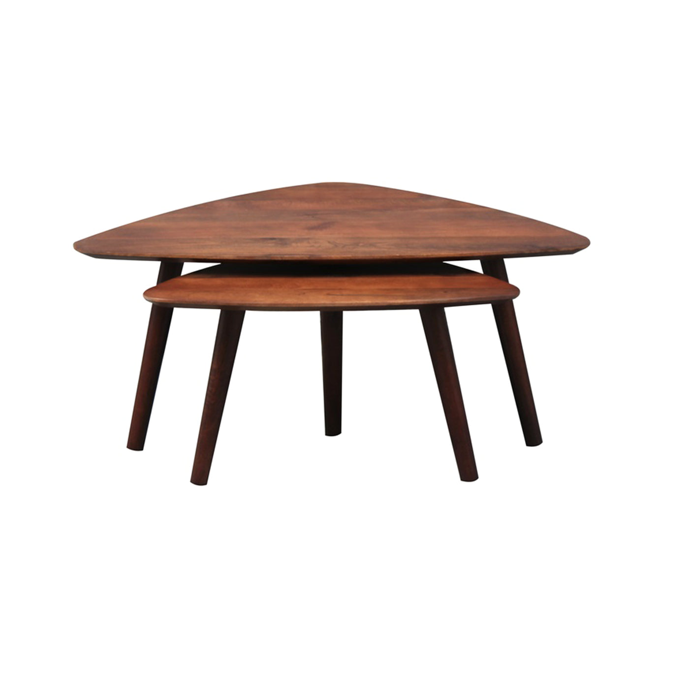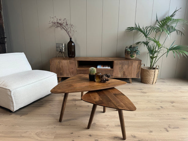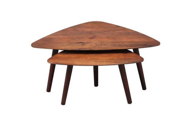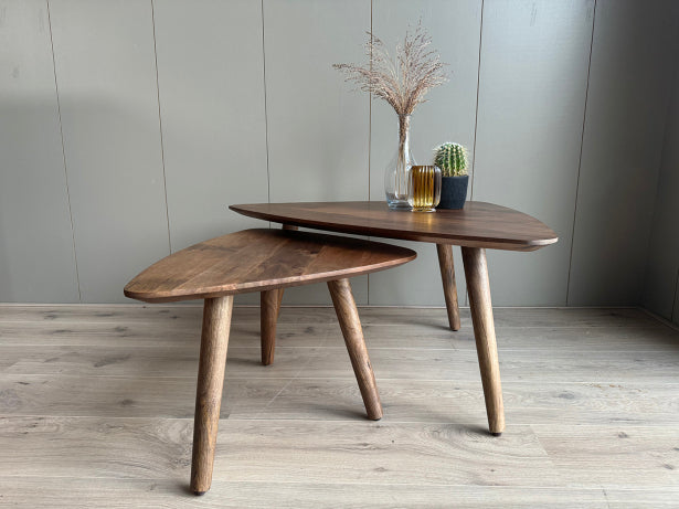 Salontafel triangel van massief mangohout set van 2 ✓ Type tafel: Salontafel ✓ Vorm tafelblad: Triangel ✓ Materiaal tafelblad: Mangohout ✓ Kleur tafelblad: Bruin ✓ Afwerking tafelblad: Walnoot kleur ✓ Materiaal onderstel: Mango hout ✓ Kleur onderstel: Bruin ✓ Lengte x Breedte x Hoogte: 100x70x42cm / 70x50x38cm ✓ Merk: Old Inn Wonen