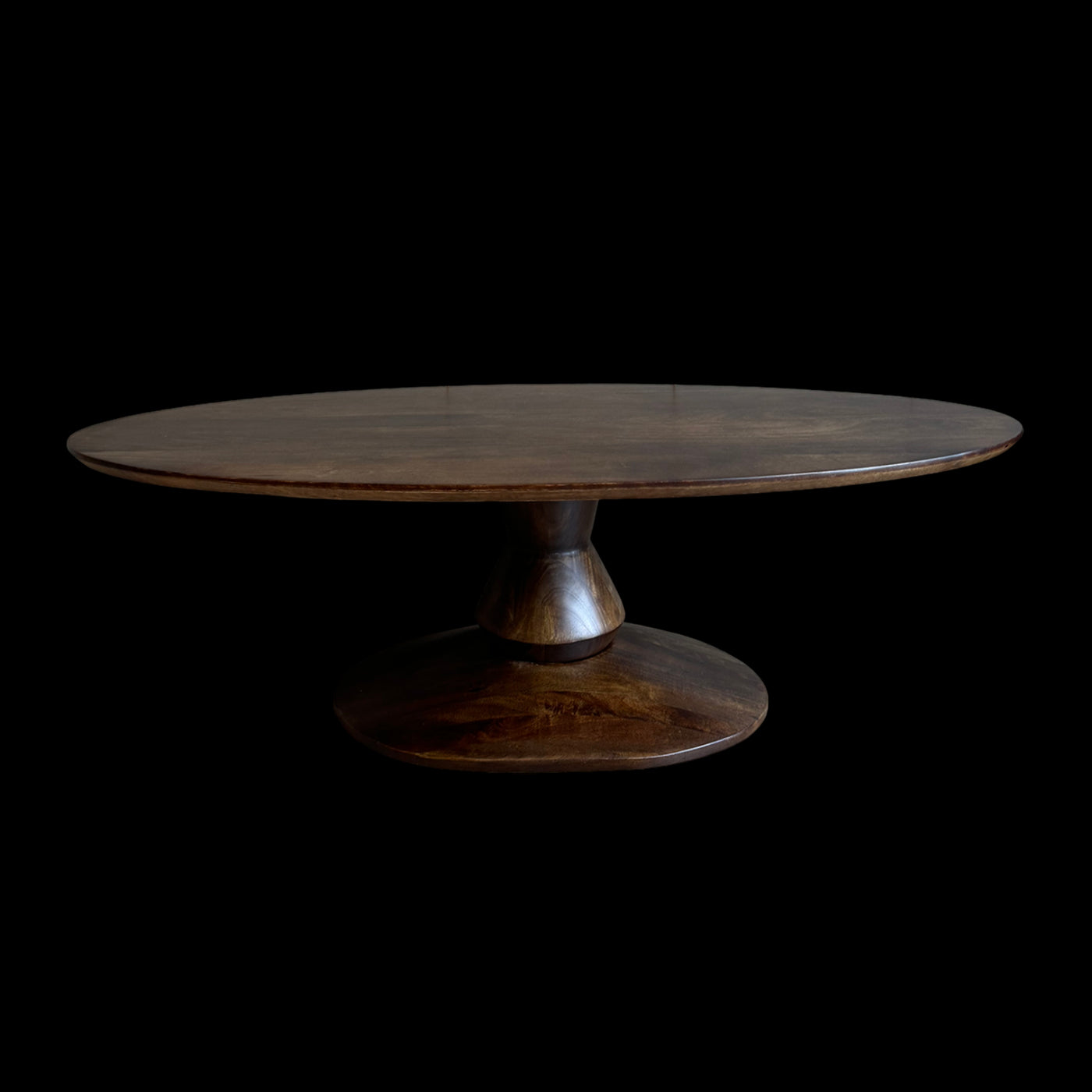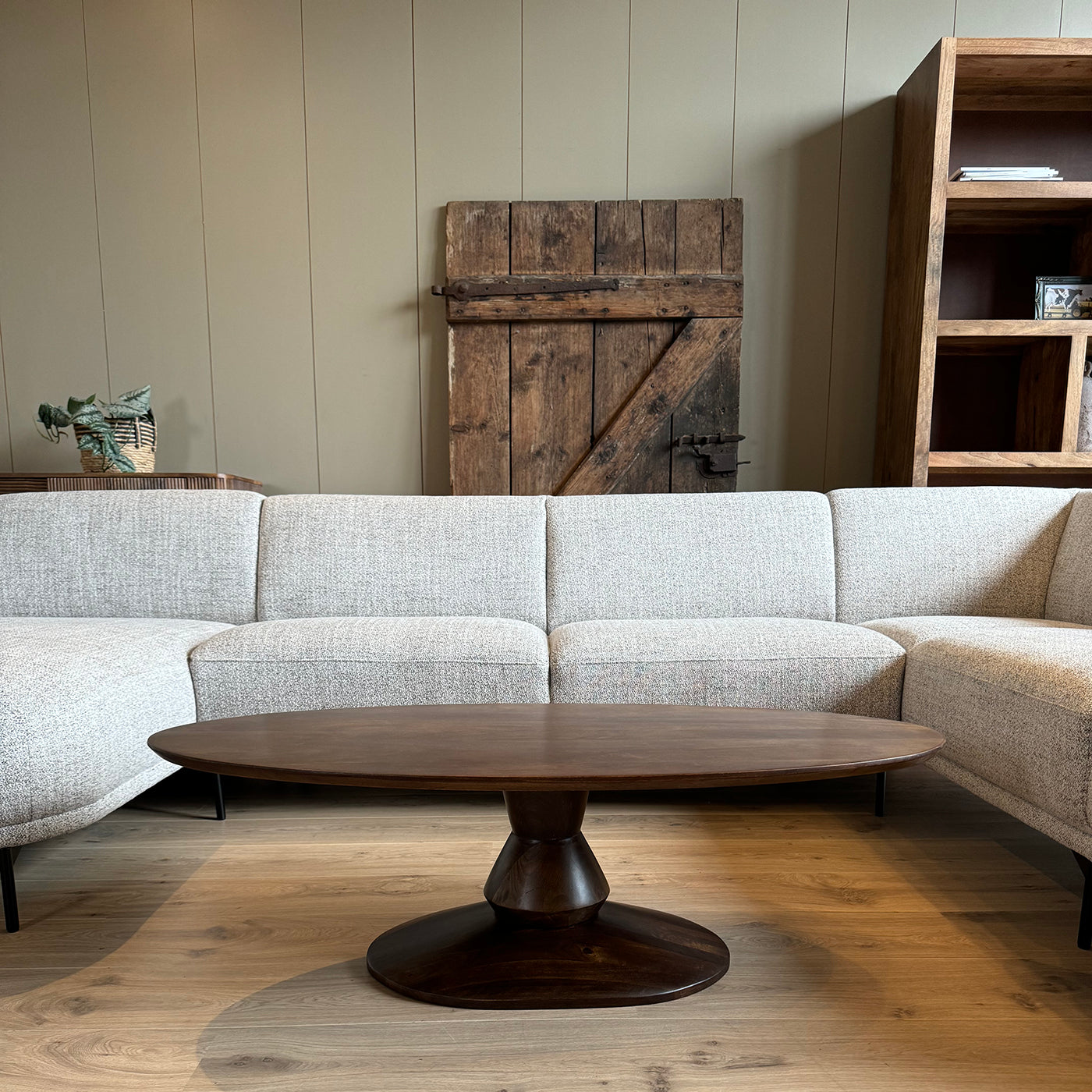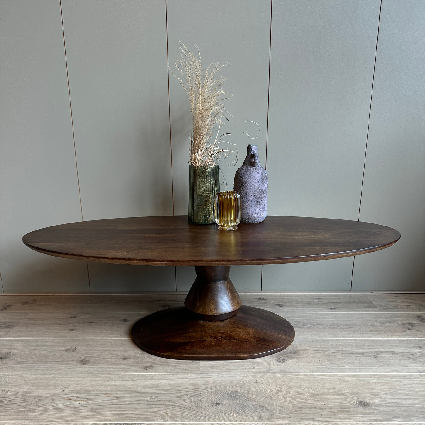 Deze salontafel past moeiteloos in verschillende interieurstijlen, van modern tot traditioneel en alles daartussenin. Het is een tijdloos meubelstuk dat zowel stijl als functionaliteit brengt, en een prachtige aanvulling vormt op elke woonkamer. Kortom, de ovale salontafel van mangohout met een walnoot lak is een ideale keuze voor wie houdt van natuurlijke elegantie en duurzaamheid.