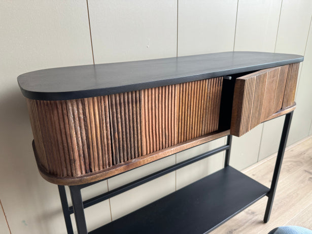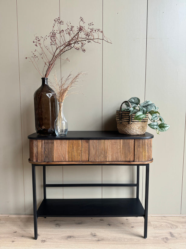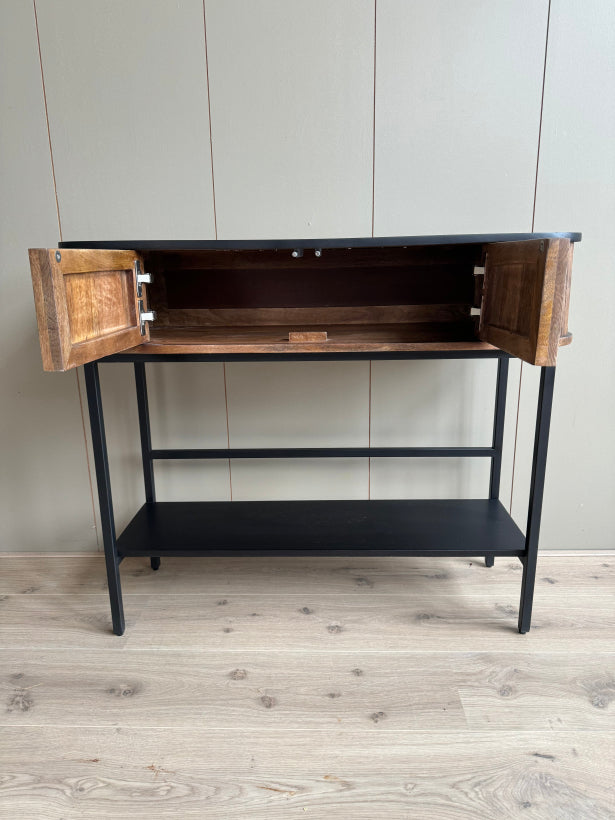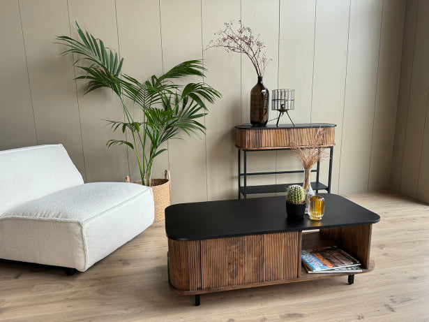 Side-table Lima rechthoek van mango hout ✓ Type tafel: Sidetable ✓ Vorm tafelblad: Rechthoek ✓ Materiaal tafelblad: Mangohout ✓ Kleur tafelblad: Zwart ✓ Afwerking tafelblad: Zwarte kleur ✓ Materiaal onderstel: Metaal ✓ Kleur onderstel: Zwart ✓ Dia x Hoogte: 100x35x82cm ✓ Merk: Old Inn Wonen