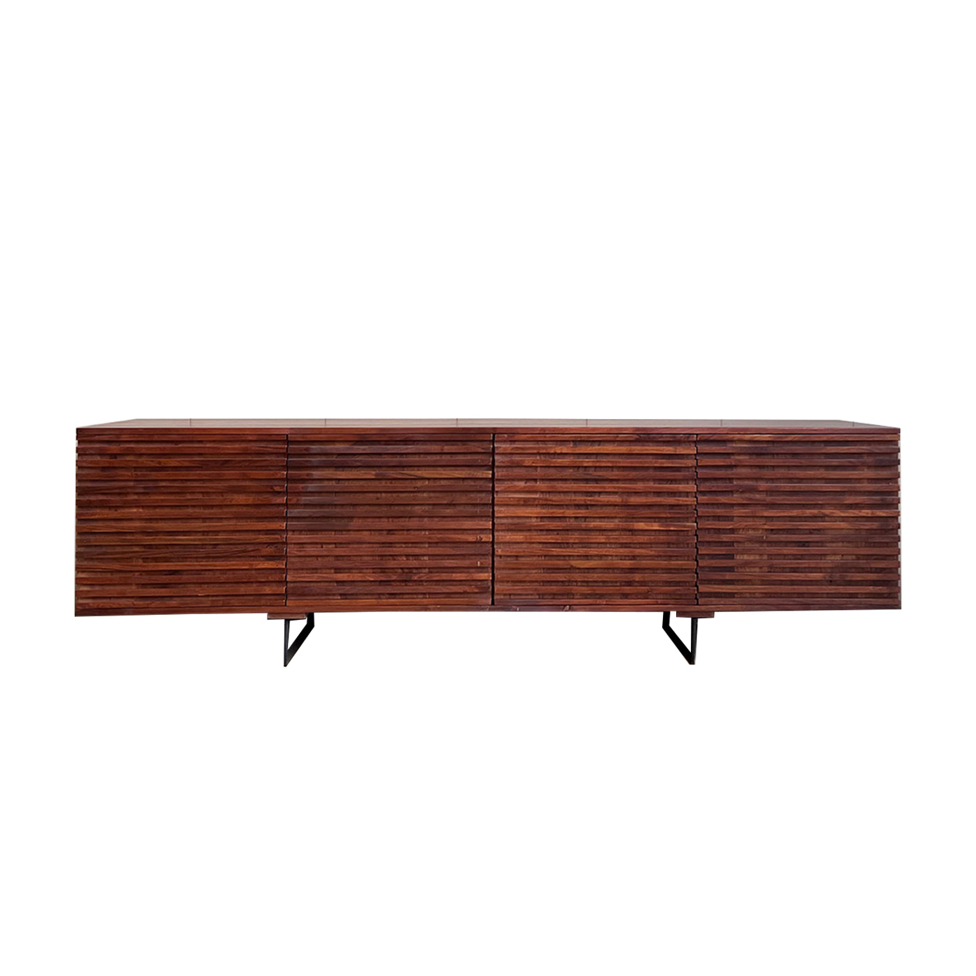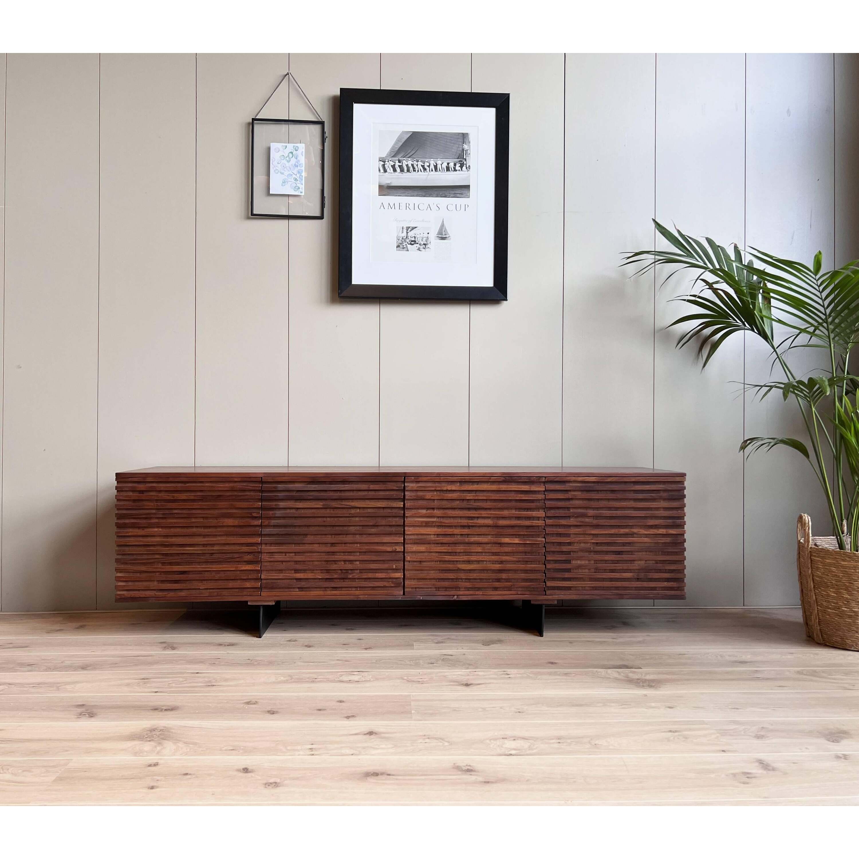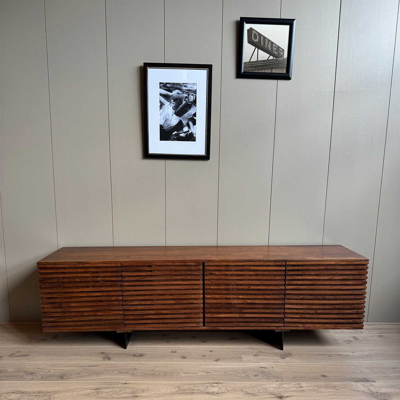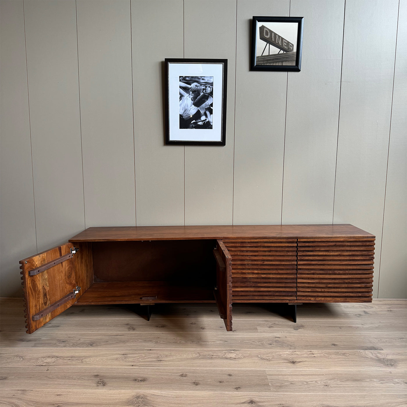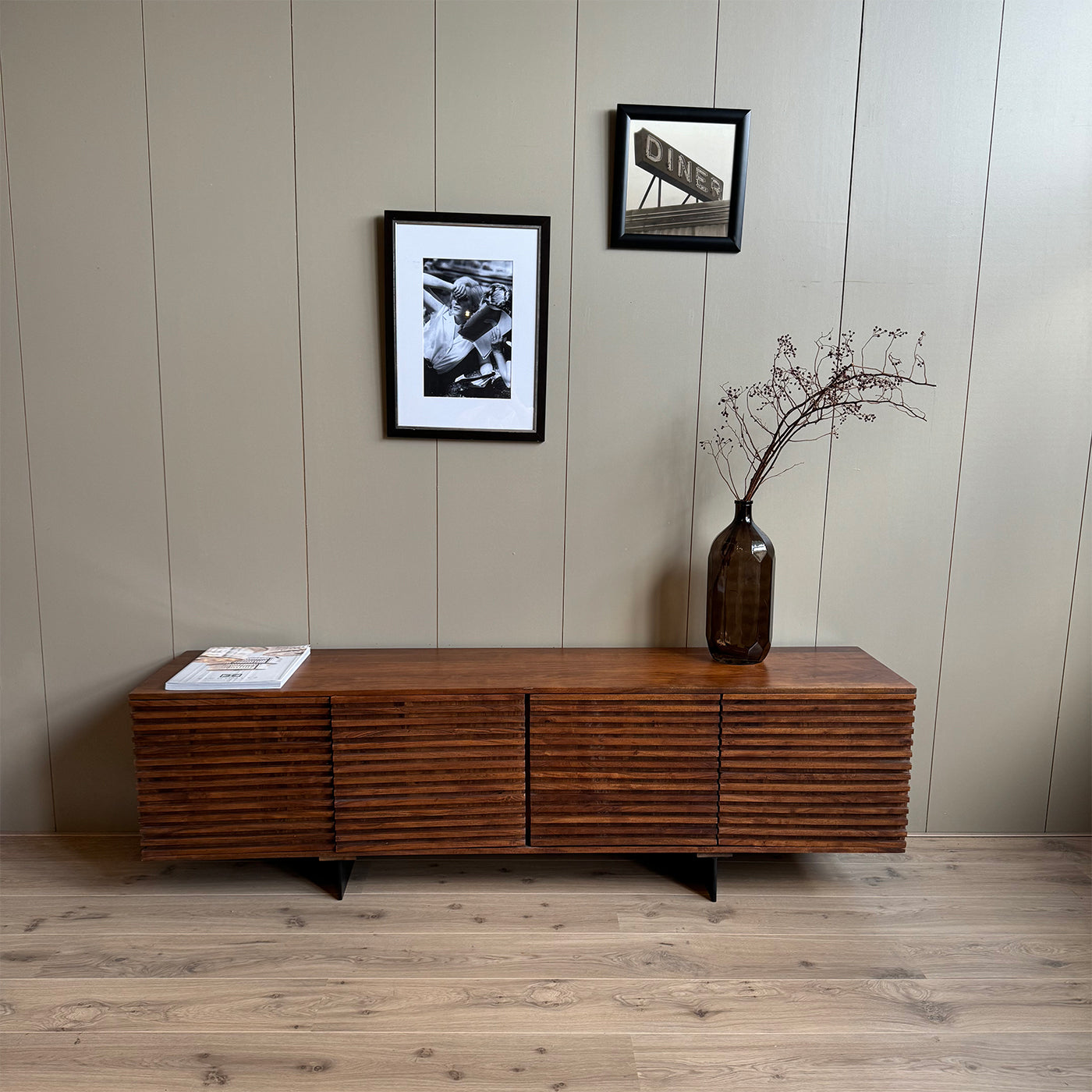 Tv-meubel gemaakt van Acacia hout in een walnoot kleur: ✓ Type Kast: Tv-meubel ✓ Materiaal Kast: Acacia ✓ Afwerking: Walnoot kleur ✓ Materiaal onderstel: Staal ✓ Kleur Onderstel: Zwart ✓ Lengte: 200cm ✓ Hoogte: 57cm ✓ Diepte: 46cm ✓ Met planken: Nee ✓ Kleur: Donkerbruin ✓ Merk: Old Inn Wonen