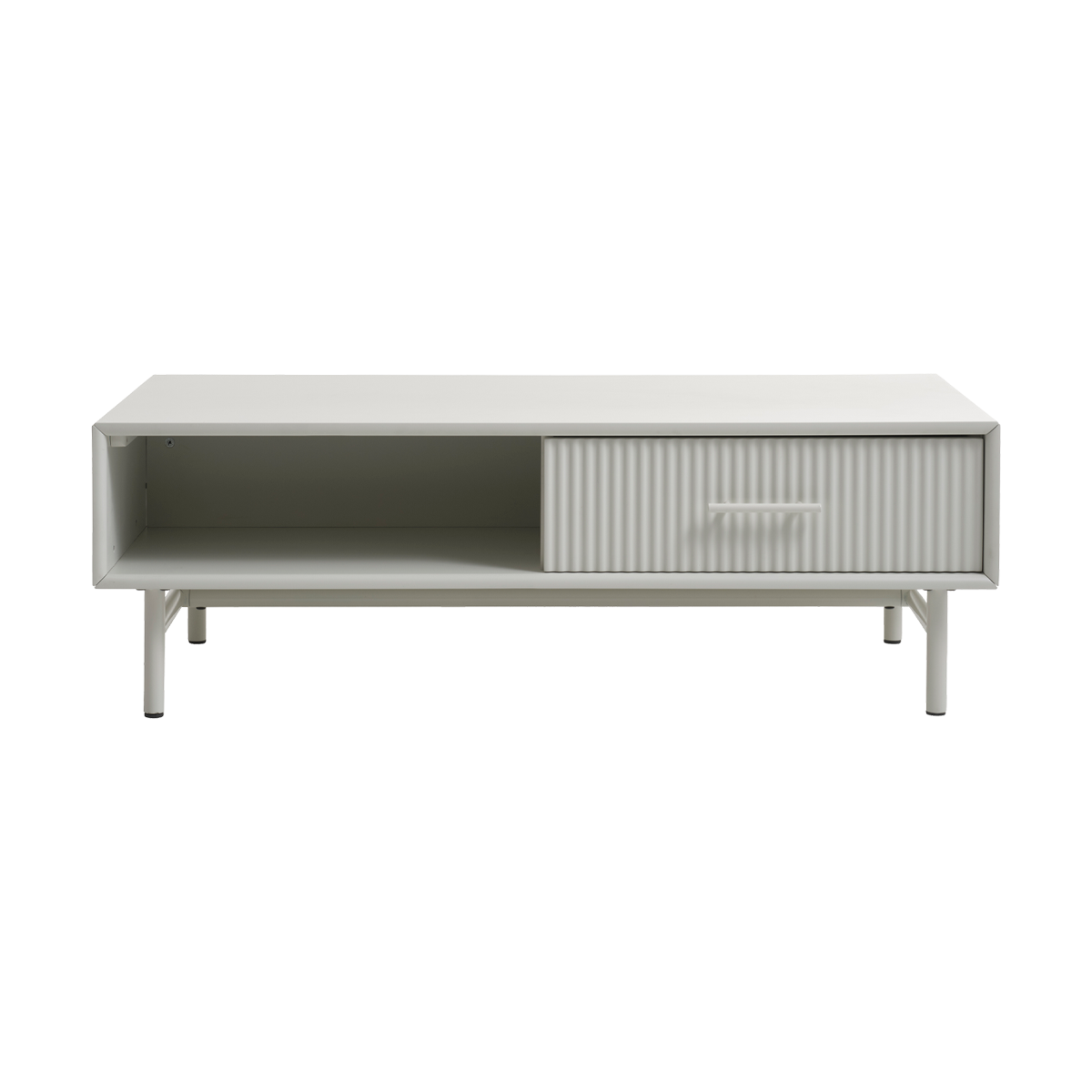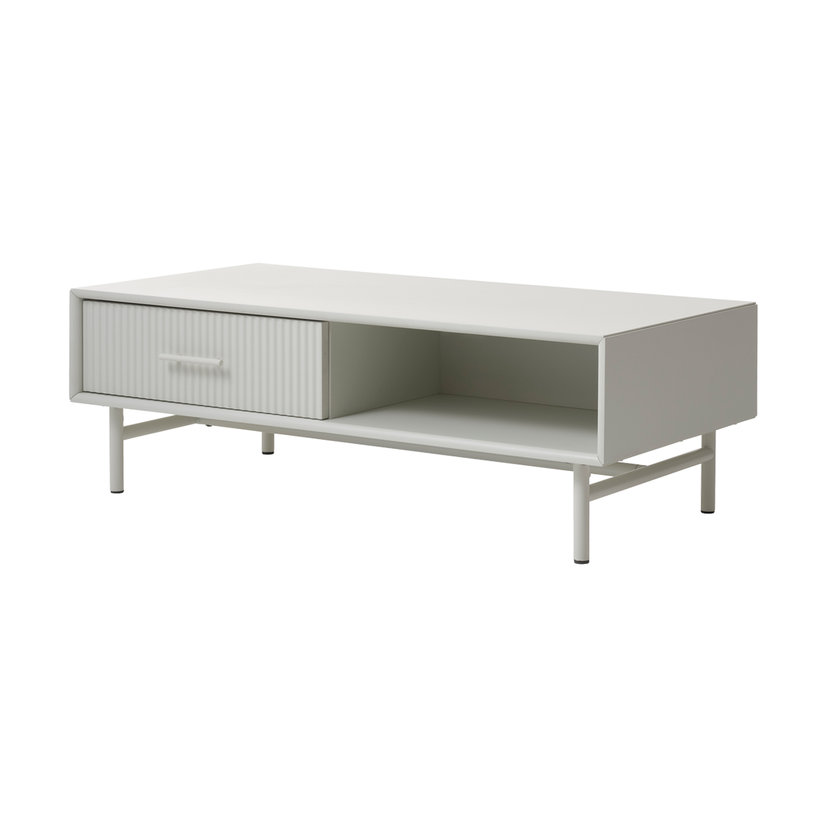 Het tafelblad van deze salontafel is gemaakt van hout en de poten zijn gemaakt van metaal. De salontafel is ontworpen met zowel een lade als een opbergvak onder het tafelblad. Hierdoor heb je dus direct een plek om kleine spullen uit het zicht op te bergen. De houten salontafel is grijs / beige van kleur, wat ervoor zorgt dat dit tafeltje gemakkelijk met andere meubels te combineren is. Of je nu houdt van een industriële, bohemian of Scandinavische woonstijl, de Arlo salontafel is een goede aanwinst voor jouw interieur. Het moderne en minimalistische design wordt gecompenseerd door de verticale latstrcutuur op de lade, wat het ontwerp een trendy twist geeft. Zet deze houten salontafel in je woonkamer en geniet van een opgeruimde tv-hoek. Is de Arlo salontafel helemaal jouw smaak? Kijk dan ook eens naar de andere meubels uit deze serie van Olivine.