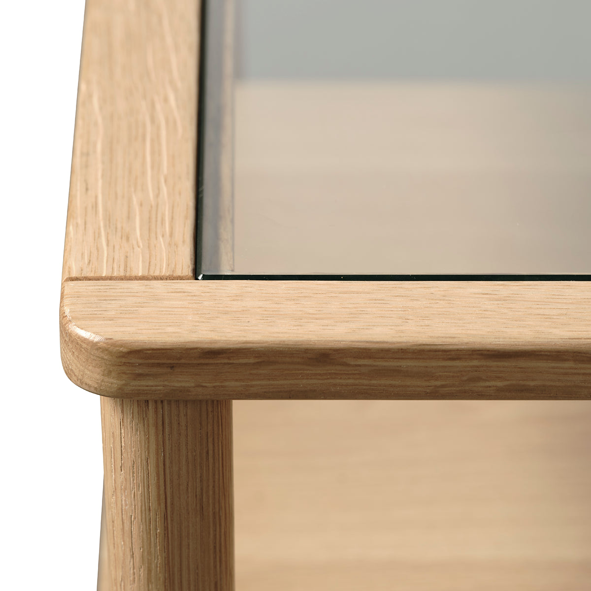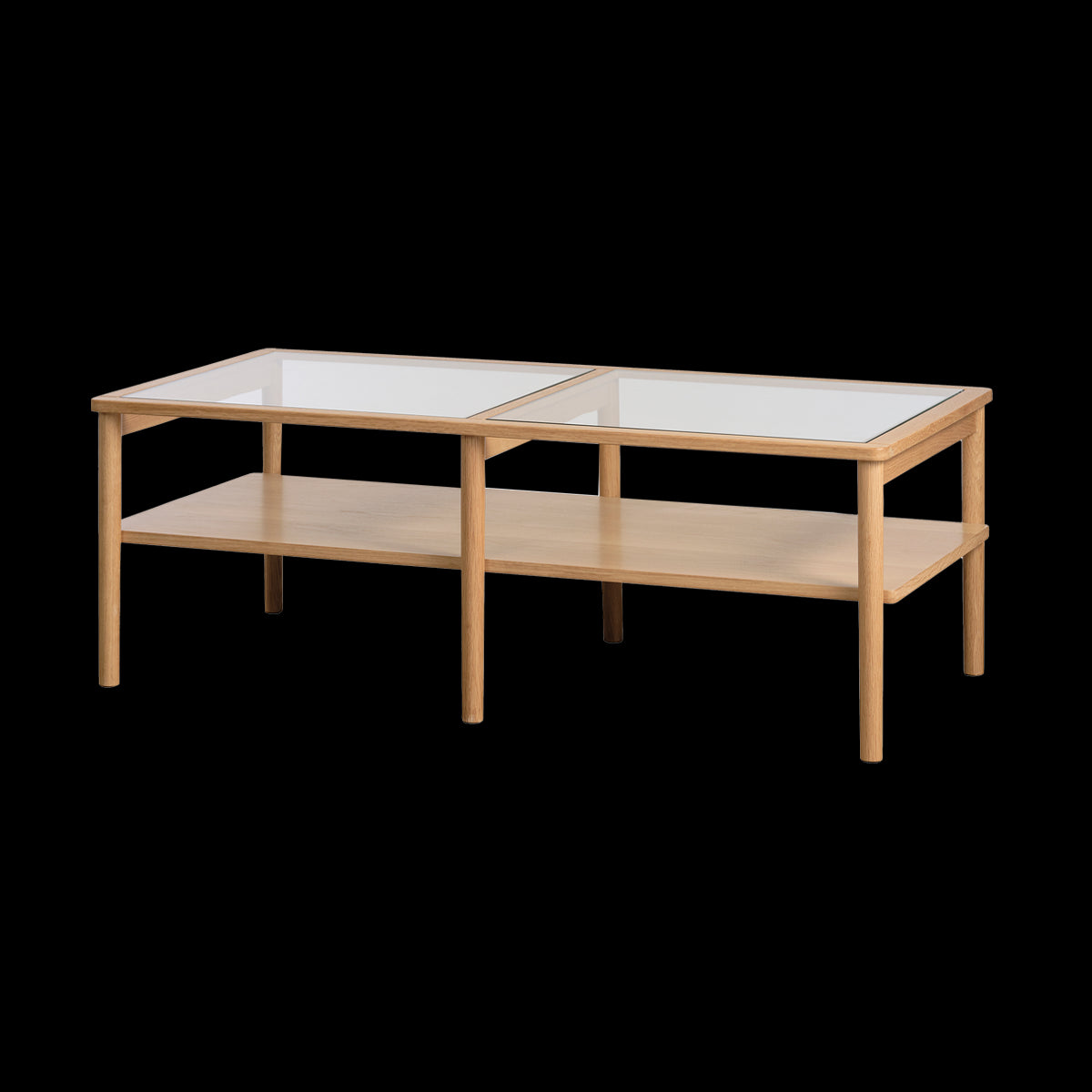 Dankzij de combinatie van eikenhout en een glazen tafelblad is deze salontafel een opvallend en functioneel meubelstuk in elk interieur. De naturel houtkleur zorgt voor een warme uitstraling en het glazen tafelblad zorgt voor een moderne touch. De tafel heeft afmetingen van 120 x 60 cm en heeft een extra opbergruimte onder het tafelblad. Voldoende ruimte dus voor het plaatsen van decoratieve items, boeken, tijdschriften en andere woonaccessoires.
