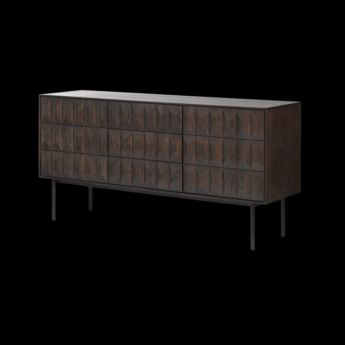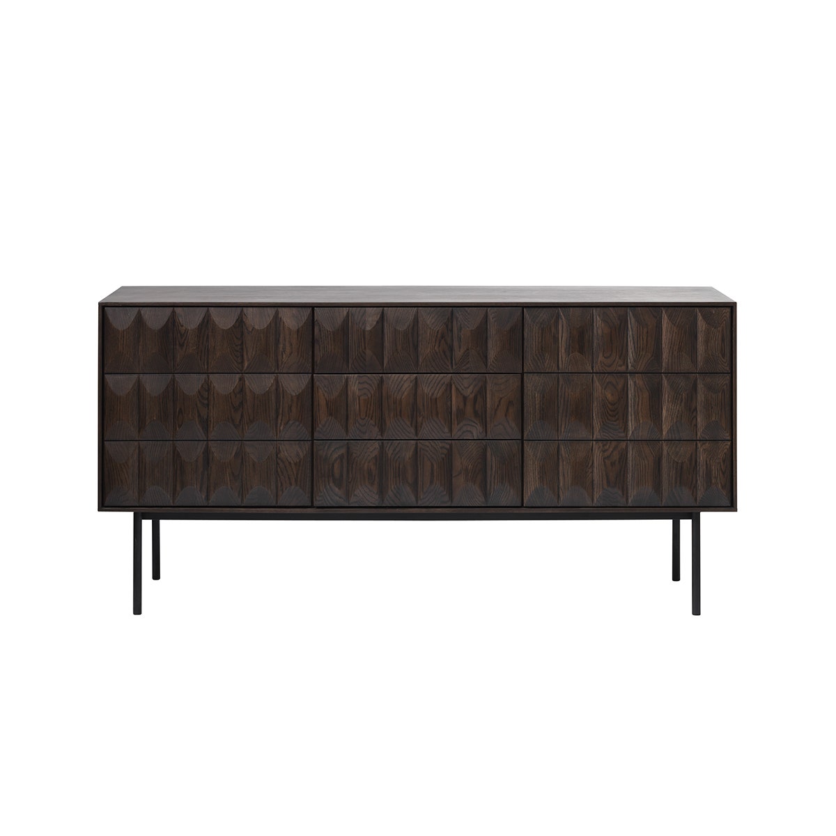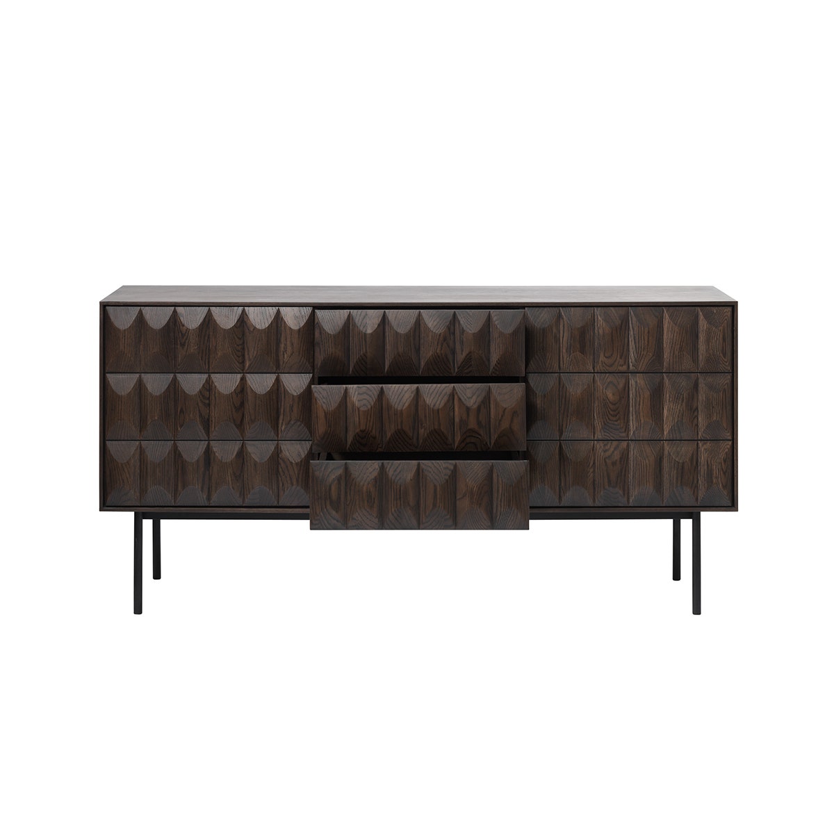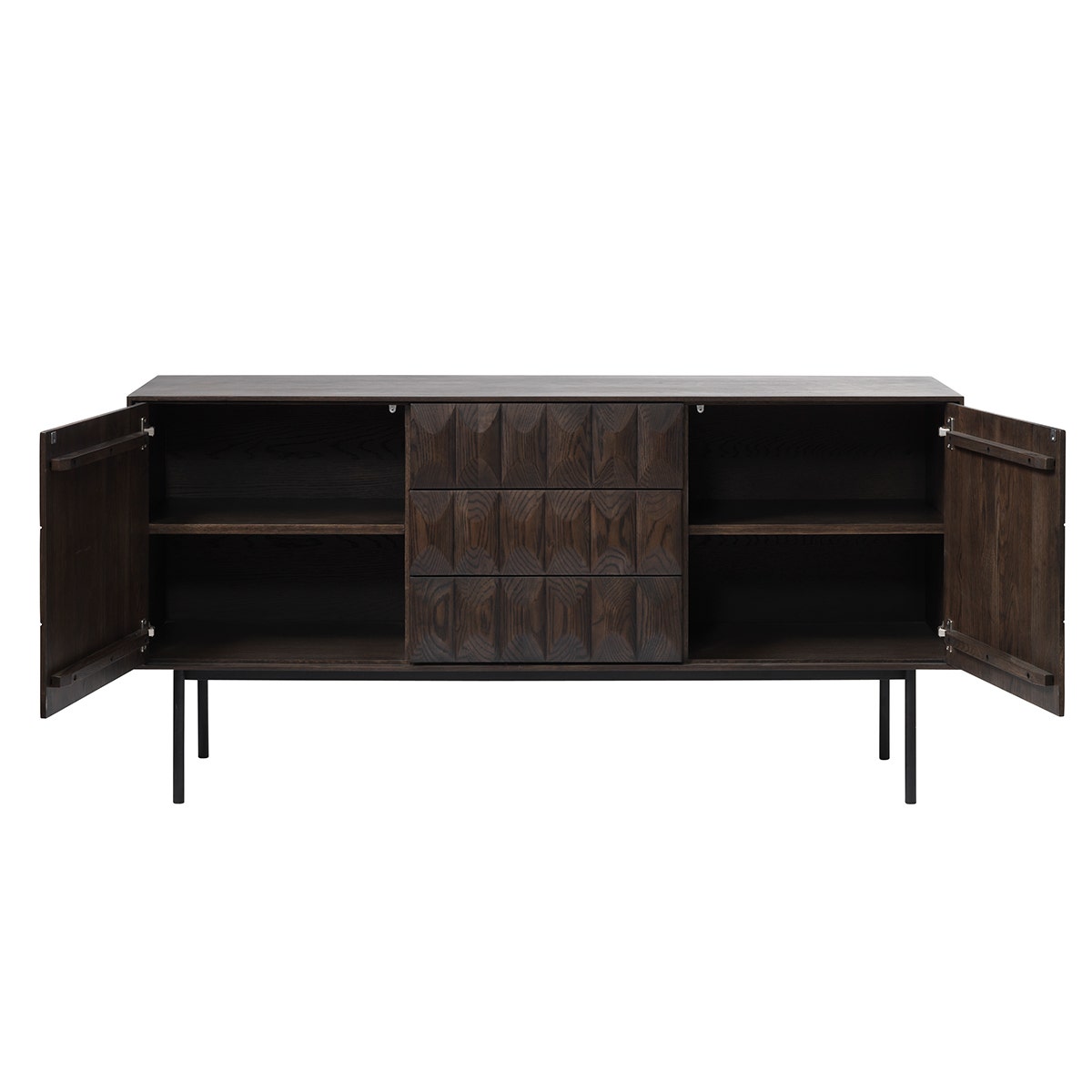 Deze prachtige kast is gemaakt van hout met een laag eikenfineer. De deuren en lades zijn gemaakt van massief eikenhout en hebben een uniek patroon aan de buitenzijde. De combinatie van het donkere hout met de metalen poten zorgt voor een stoere en elegante touch. De Vanja sideboard is alles wat je nodig hebt voor extra opbergruimte in huis. Achter de twee deurtjes bevinden zich planken om spullen op te zetten. Het middelste gedeelte van de kast is voorzien van drie lades. Deze kan je perfect gebruiken voor het bijeenhouden van losse spulletjes, kleine accessoires of papierwerk.