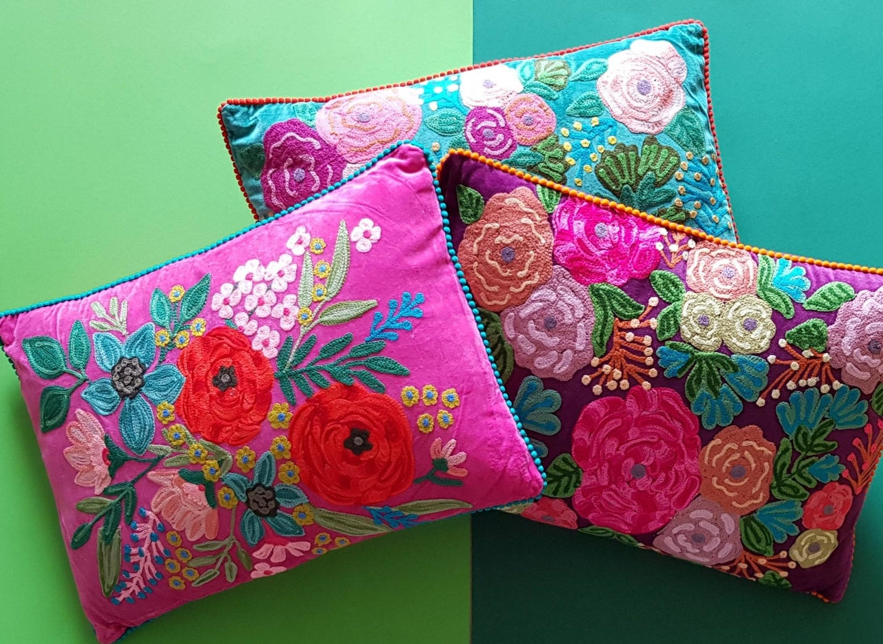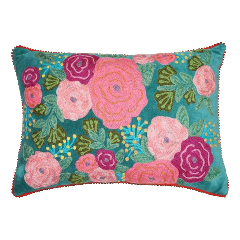 Prachtig groen velvet kussen met handgeborduurd motief van roze bloemen en groene bladeren. Het kussen is rondom afgezet met rode pompoms. Dit is een fair trade kussen, dat met de hand geborduurd is in India.