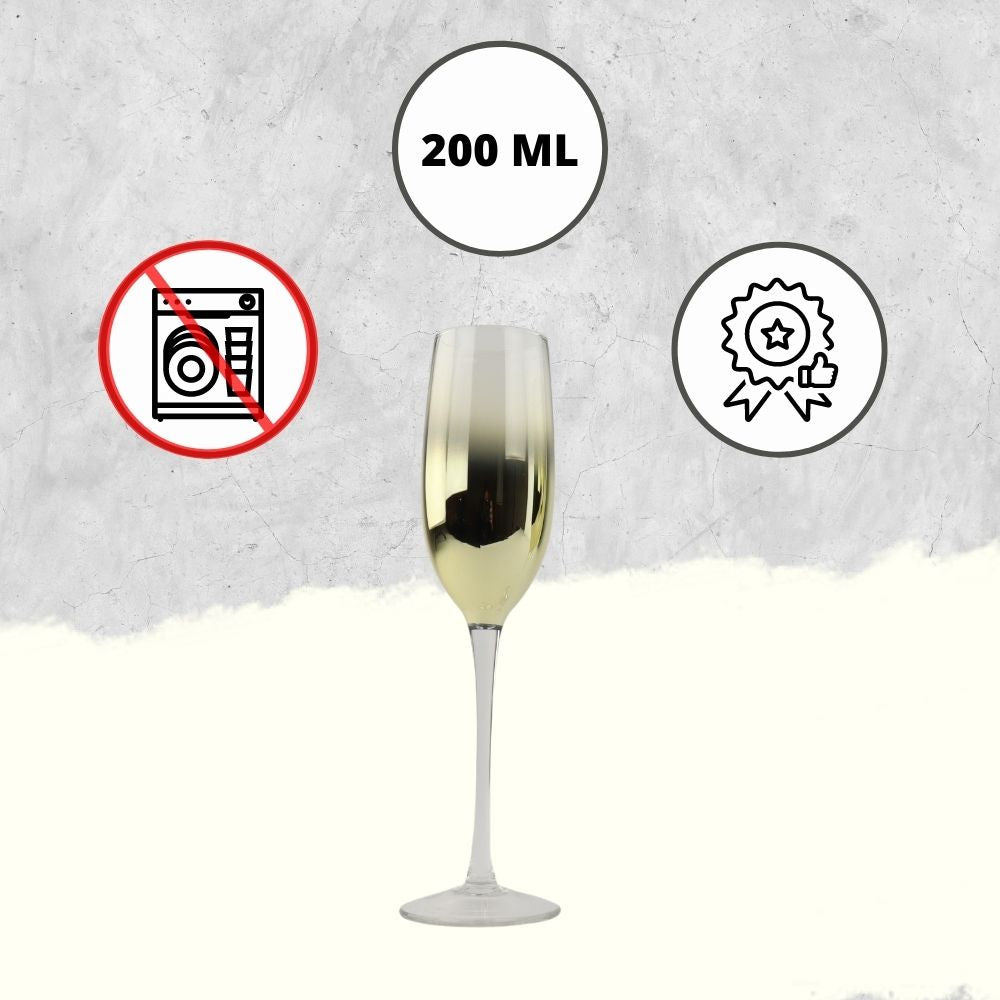 Set van gouden champagneglazen. De set bestaat uit 2 glazen met goud detail. De glazen hebben een inhoud van 200 ml en de diameter is 7 cm. Advies om de glazen met de hand af te wassen.