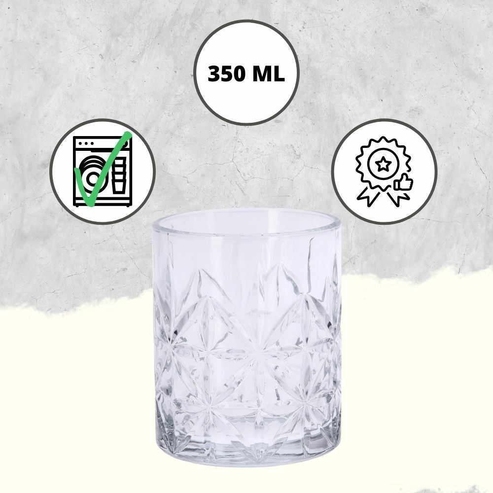 Set van klassieke drinkglazen. De set bestaat uit 4 stuks met een kristallen look. De inhoud van de glazen is 350 ml. De glazen zijn gemaakt van stevig duurzaam glas en kunnen in de vaatwasser.