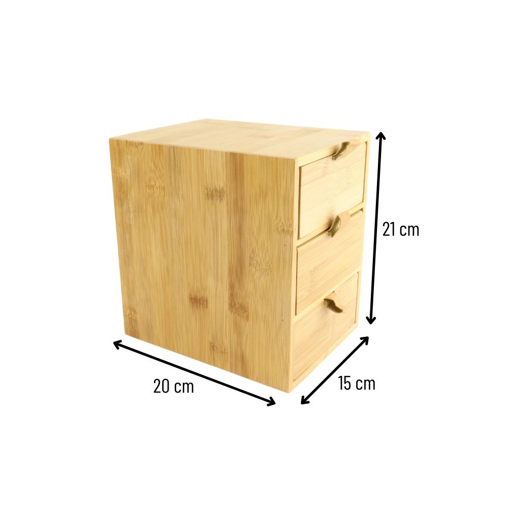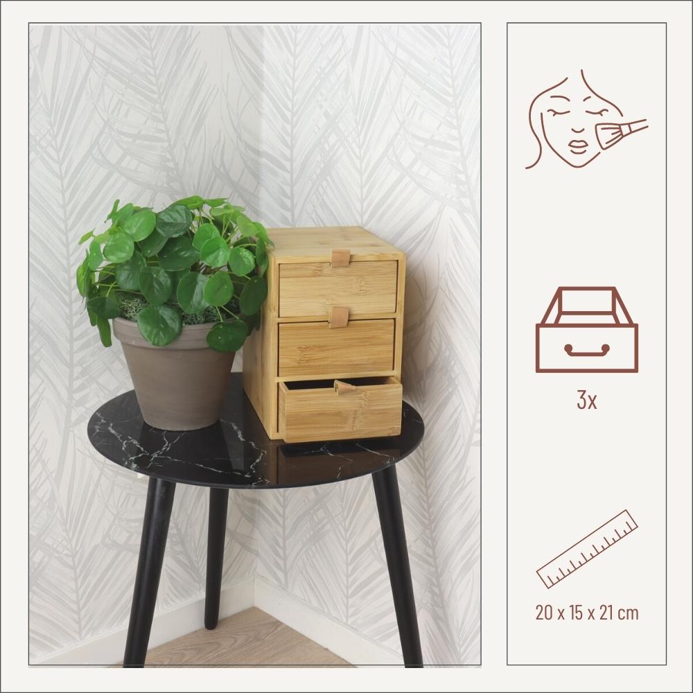 Deze opbergdoos van Orange85 is handig voor het bewaren van bijvoorbeeld make-up of kantoorartikelen. Het kastje heeft een afmeting van 20 bij 15 bij 21 cm waardoor je het overal kan plaatsen. De opbergdoos bestaat uit drie lades. Een lade heeft een afmeting van circa 20 bij 15 bij 6 cm. De lades zijn eenvoudig te openen door de grepen die bevestigd zijn aan de lade.