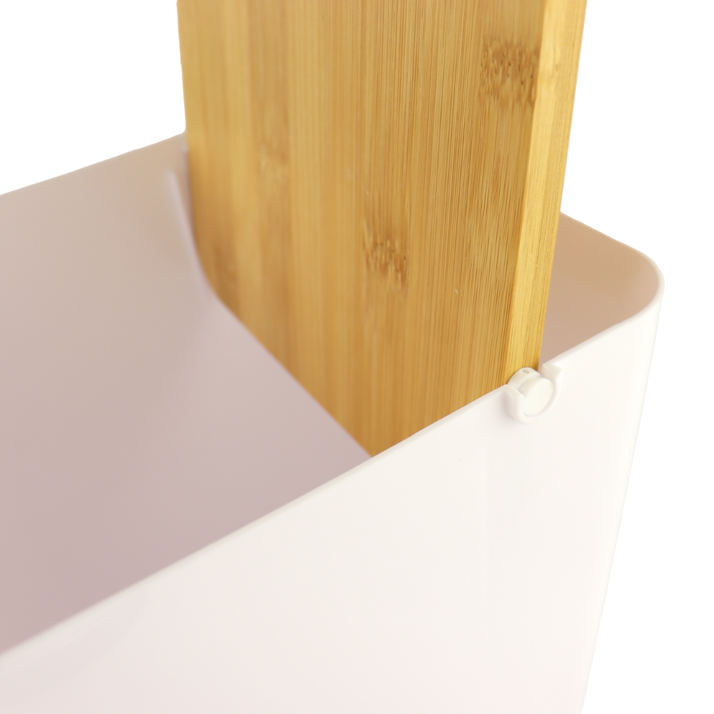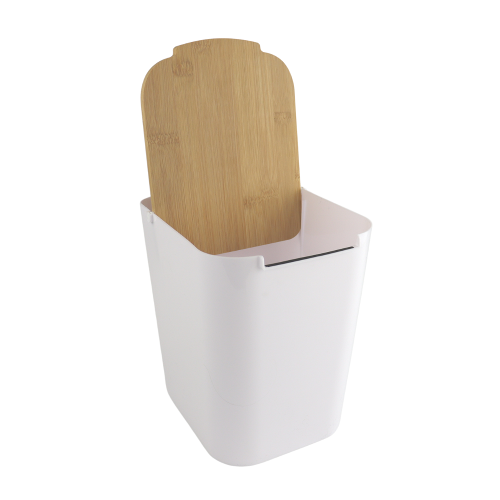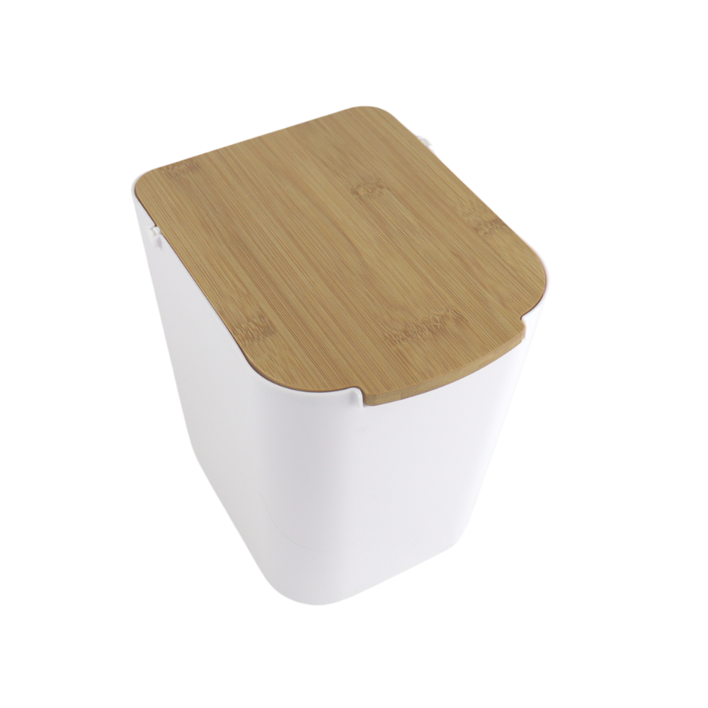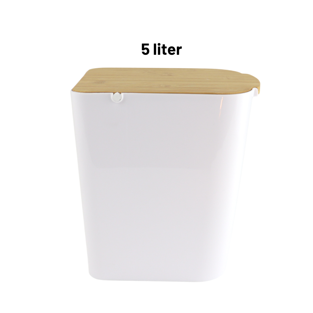 De prullenbak van Orange85 heeft 5 L aan inhoud. Geschikt voor het weggooien van klein afval. Hiernaast ook makkelijk te verschuiven en op te bergen door het kleine formaat. De prullenbak is gemaakt van kunststof en heeft een deksel van bamboe.